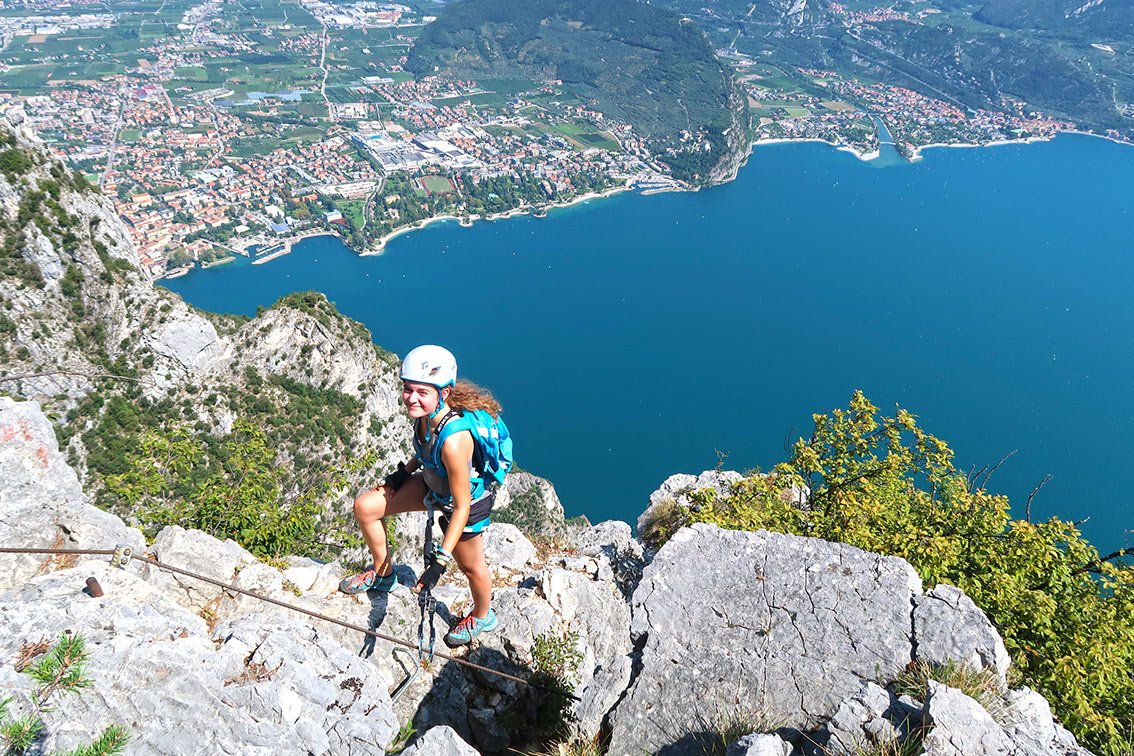 Unweit der Seemetropole Riva del Garda klettert man hoch über den blauen Fluten des Gardasees an der Südkante zum Gipfel der Cima Capi empor, von dort führen zwei weitere, sehr schön hergerichtete, leichte Klettersteige auf das Dach der Runde, den Gipfel der Cima Rocca. Egal ob man von Biacesa oder direkt von Riva del Garda zum Einstieg aufbricht, taucht man durch dichten Buschwald zu leichten, aber schönen Kletterpassagen und luftigen Graten empor. Oben dann das kühle Finale im Inneren der Cima Rocca. Der Gipfel des Berges lässt sich entweder über steile, versicherte Schützengräben oder in einem markierten Kavernensystem aus dem Ersten Weltkrieg im Inneren erforschen. Egal ob unter- oder oberirdisch, die landschaftlich schöne Klettersteigrunde ist vor allem bei Einsteigern sehr beliebt!