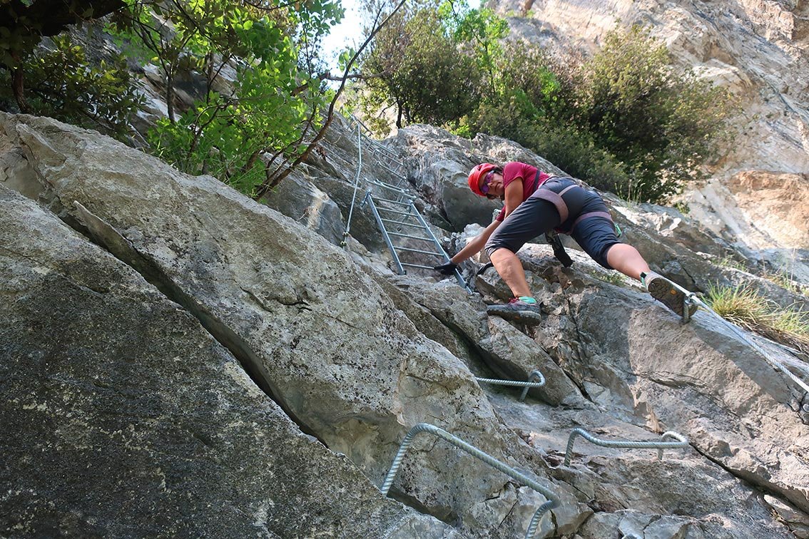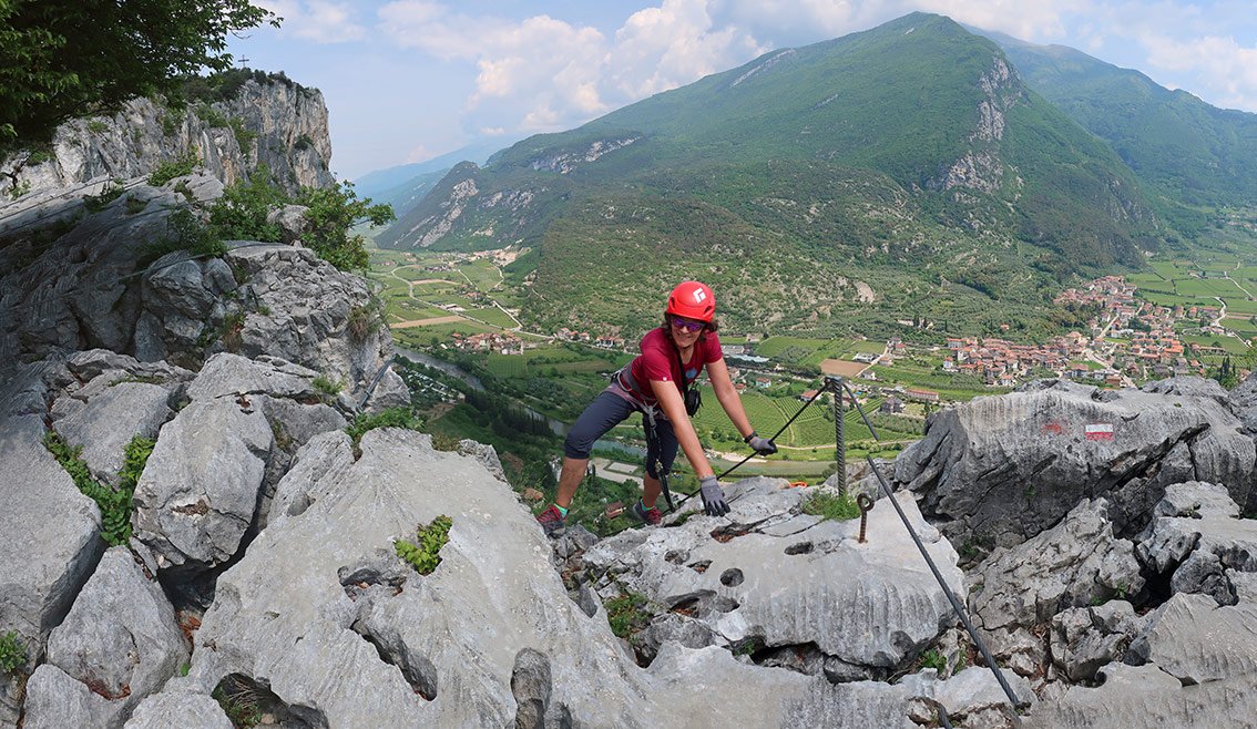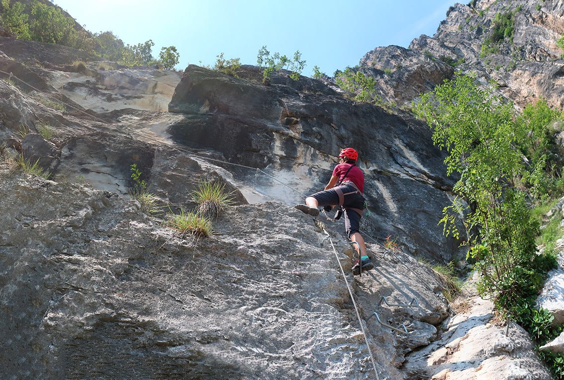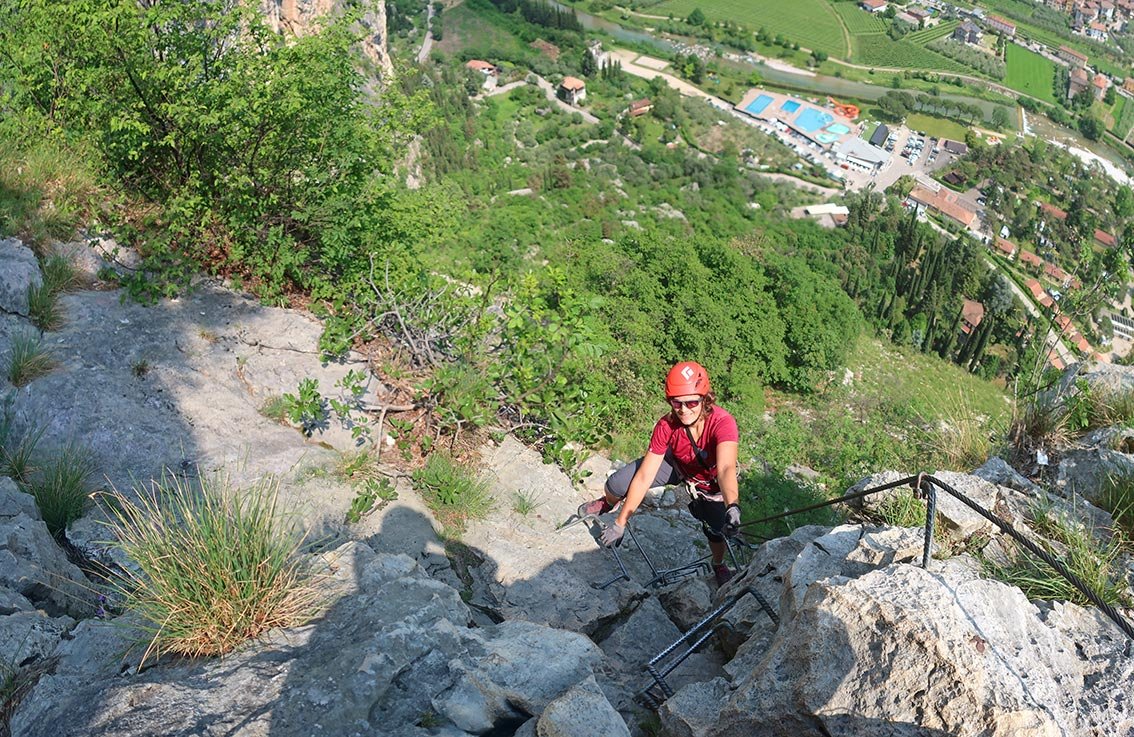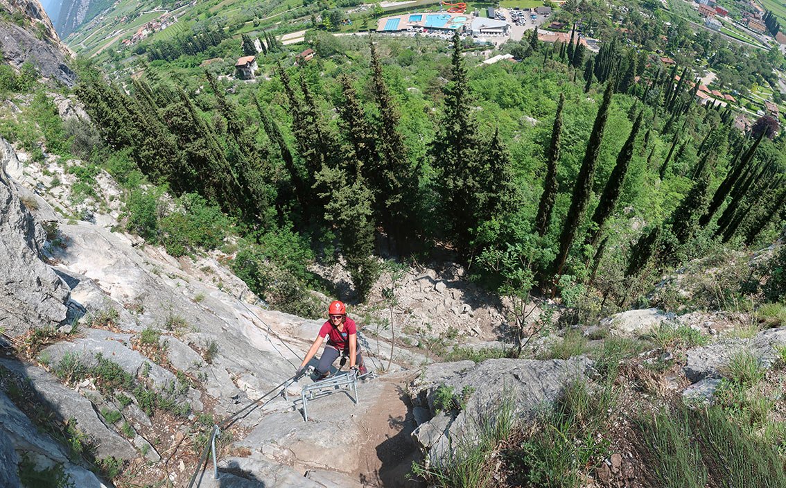 Schöner, wirklich attraktiverer Klettersteig entlang der imposanten Felswand rechts des Burgfelsens von Arco. Der Anstieg ist bis auf zwei kurze Passagen meist leicht, und somit auch für kletter erfahrene Kinder gut geeignet. Oben kommt man auf ein schönes Karstplateau und steigt dann auf der Rückseite des Berges wieder ab. Lohnend ist auf jeden Fall der Tiefblick ins Sarcatal und auf den Gardasee! Der Rückweg führt durch die schöne Altstadt von Arco - vorbei an einem Eisgeschäft.