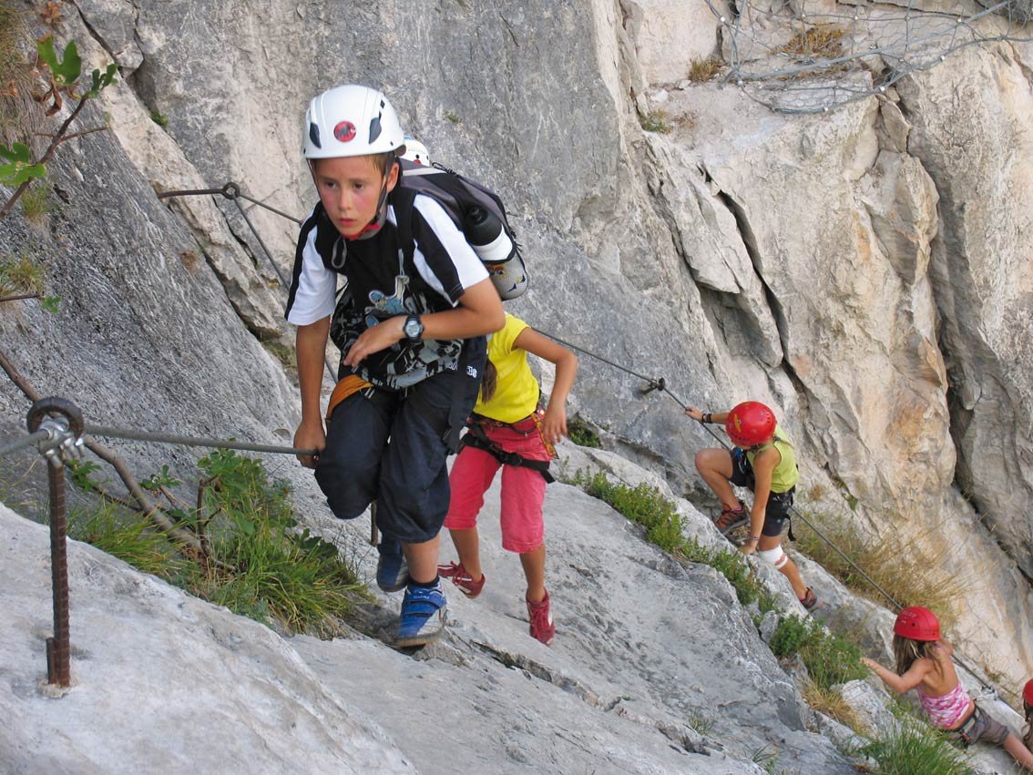 Komplette Klettersteigausrüstung, für Kinder evtl. ein Sicherungsseil und Helm.
