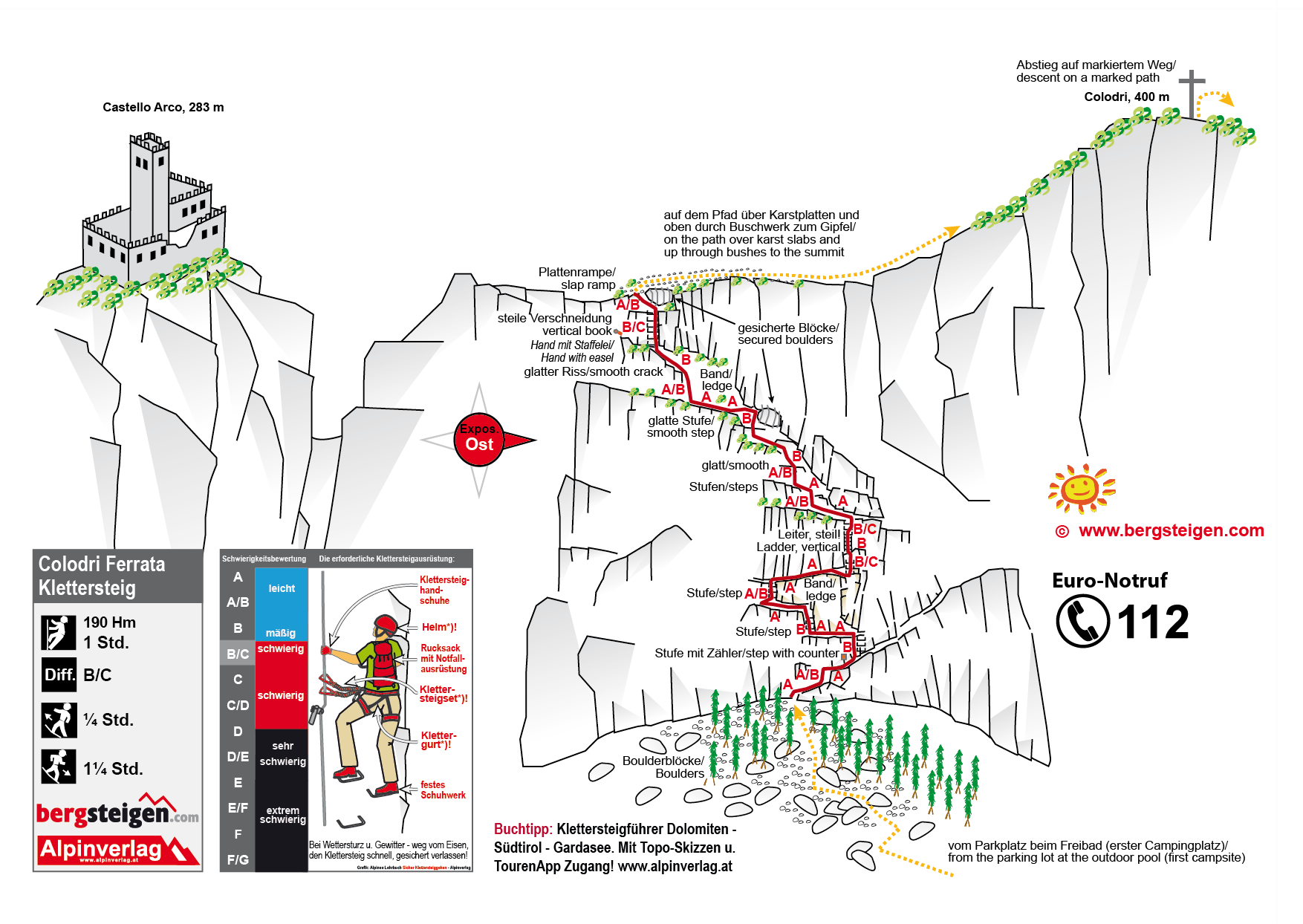 Da meistens sehr viele Bergsteiger unterwegs sind, sollte man auf jeden Fall mit Helm klettern! Die Colodri Ferrata kann man auch noch nach einer stundenlangen Anreise als Auflockerung machen. In den Sommermonaten ist es sehr heiß. Der Klettersteig ist auch gut mit einem Besuch des Castello Arco zu kombinieren - in Laghel hält man sich links und steigt kurz zur schön hergerichteten Burganlage auf.