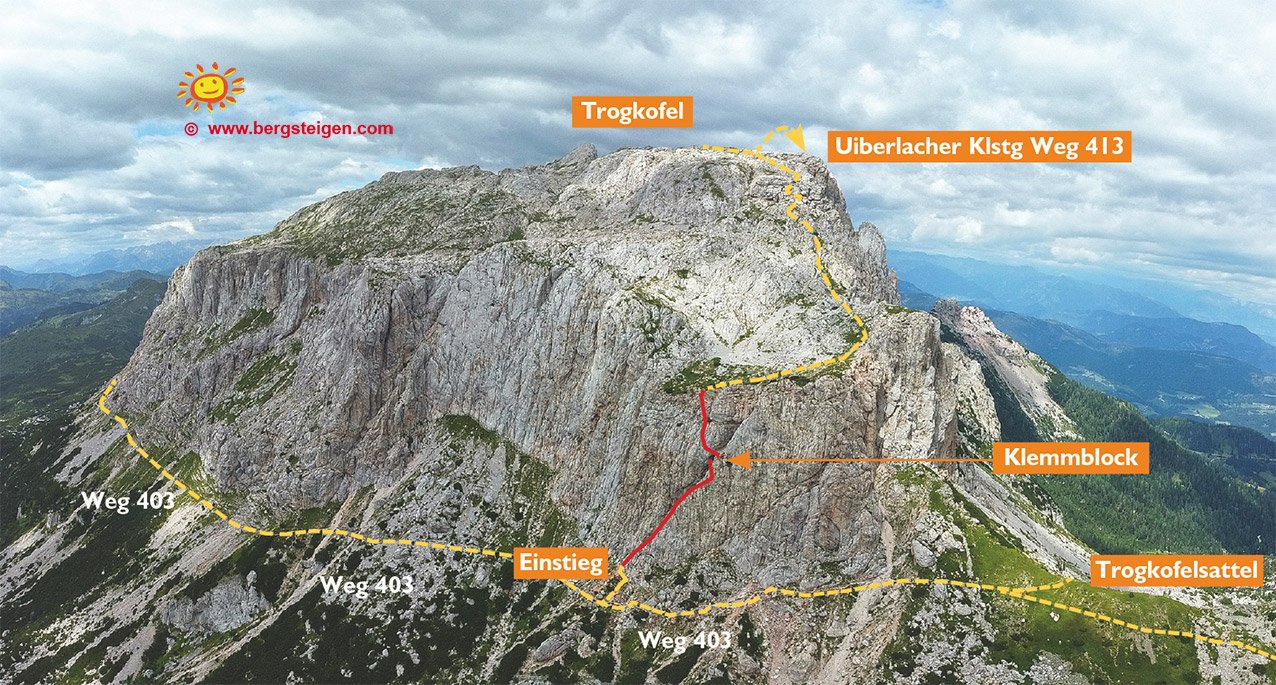 Zuerst in einer Rinne (A/B bis B) und dann über den rechten Begrenzungsrand (kurz B/C) aufwärts. Über eine mit Trittbügeln versehene enge Rinne (B) zu einem Klemmblock. Unter diesem durch zu einem kleinen Absatz (B) mit dem Steigbuch. Eine ausgesetzte Wandstufe (B) leitet zum Ende der Versicherungen. Über eine Steilstufe (kurz 1-) auf das Wiesenplateau (Ausstiegstafel). Man folgt den unscheinbaren Markierungen auf dem Trogkofel-Plateau und erreicht in ca. 30 Minuten den Gipfel (Gehgelände, orange-blau markiert).