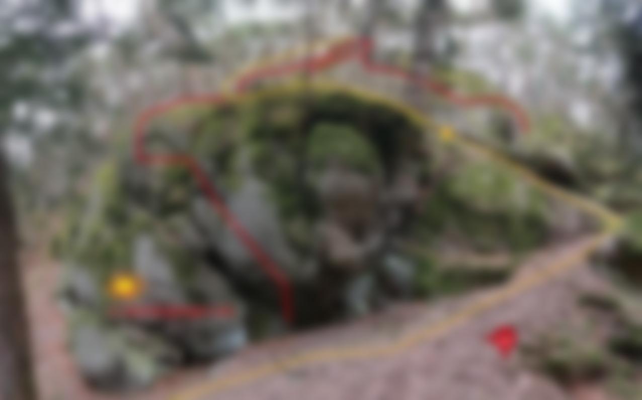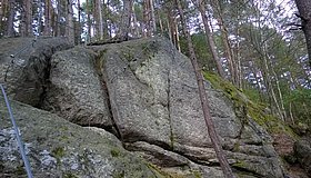 Unterer Felsen mit ca. 5 Klettermetern (ca. B Schwierigkeit). Beim oberen Felsen gibt es 3 Varianten: Links B/C, Mitte C und rechts auch C.