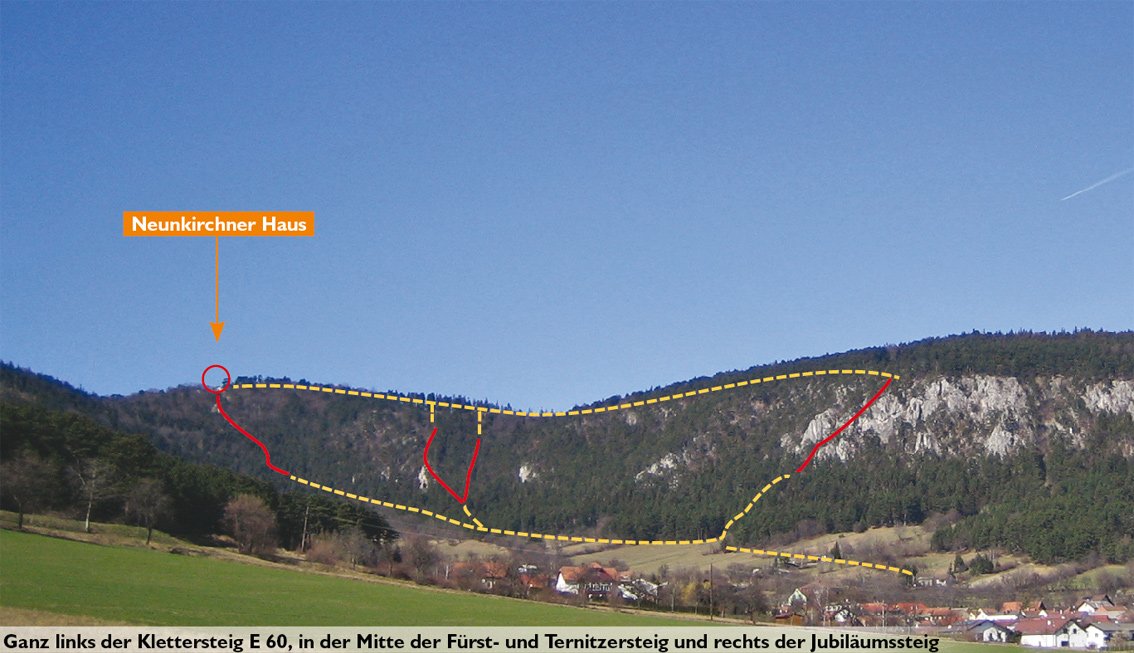 Vom Ausstieg in Kürze im Gestrüpp an die Geländekante und links zum Neunkirchner Haus. Über den Wanderweg zurück zum Ausgangspunkt.