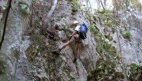 Nach der erdigen Einstiegswand (B/C) geht es über ein flacheres Stück (A/B) zu einem kleinen Absatz. Der nun folgende Überhang (C) stellt die Schlüsselstelle des ersten Abschnitts dar. Danach geht es leichter (zuerst A/B, dann A) ins Gehgelände. Dem Wegweiser folgend nach links über Steigspuren zum zweiten Abschnitt.