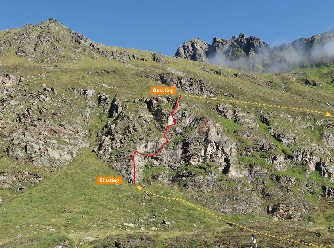 Von der Oberisshütte zur Franz Senn-Hütte. Von der Hütte über den Alpeiner Bach und nur sehr kurz dem Weg in Richtung Rinnenspitze folgen. Dann auf den Steigspuren links zum Einstieg am Fuß der schon gut sichtbaren Felswand abzweigen. Einstieg bei gelber Tafel.