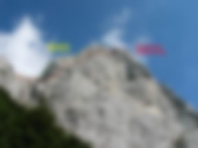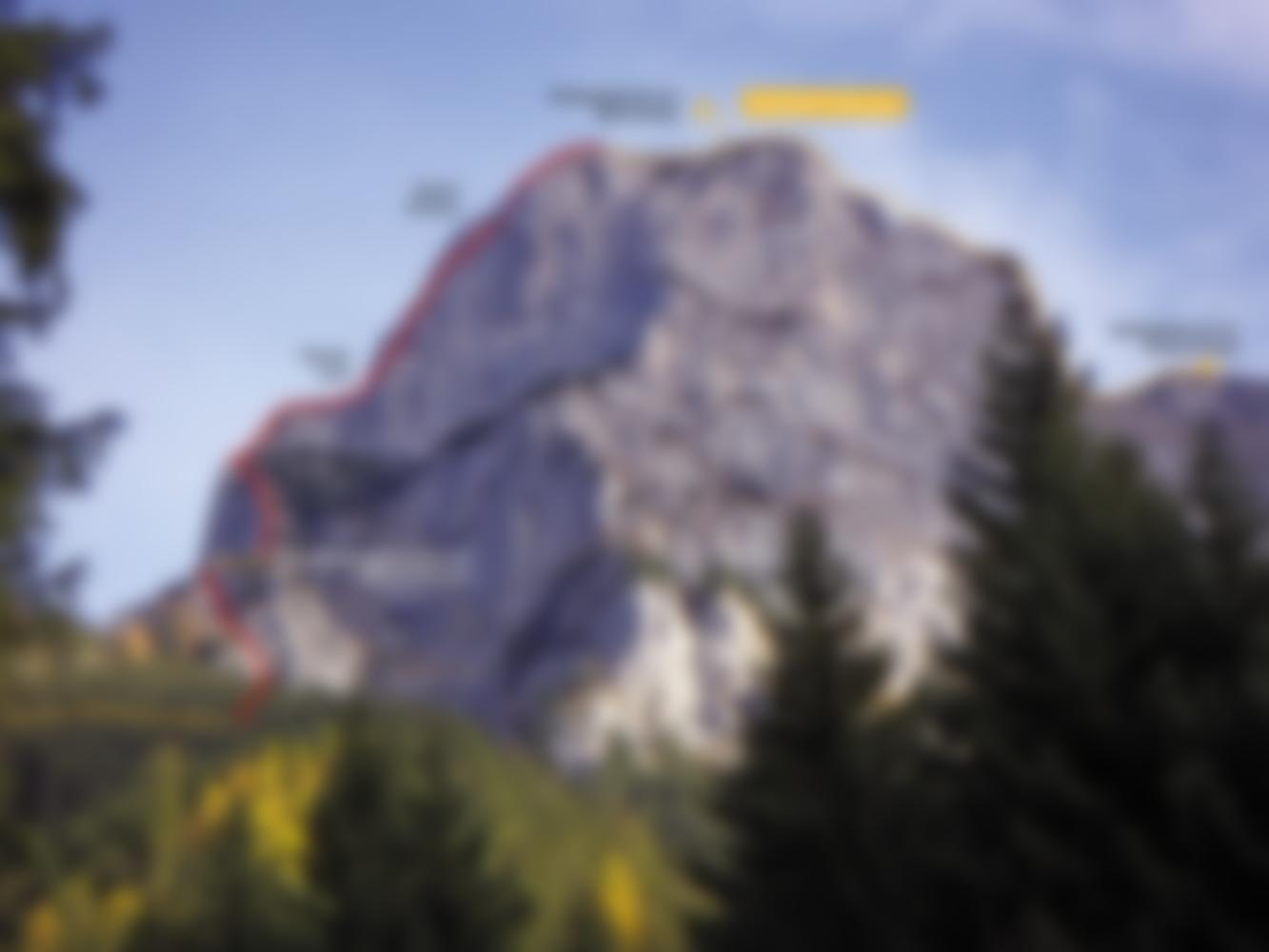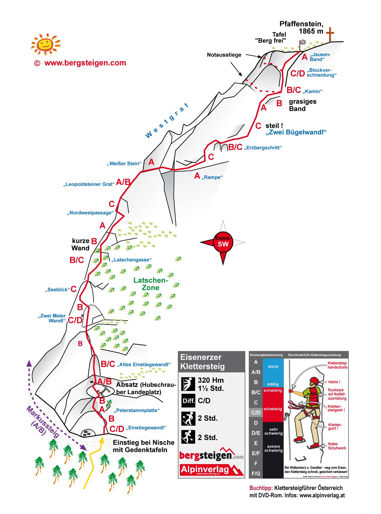 Gut zu sehen der Verlauf des Klettersteiges neben dem Westgrat. In Gelb der Westgrat (Klettertour) in Rot der Eisenerzer Klettersteig.,