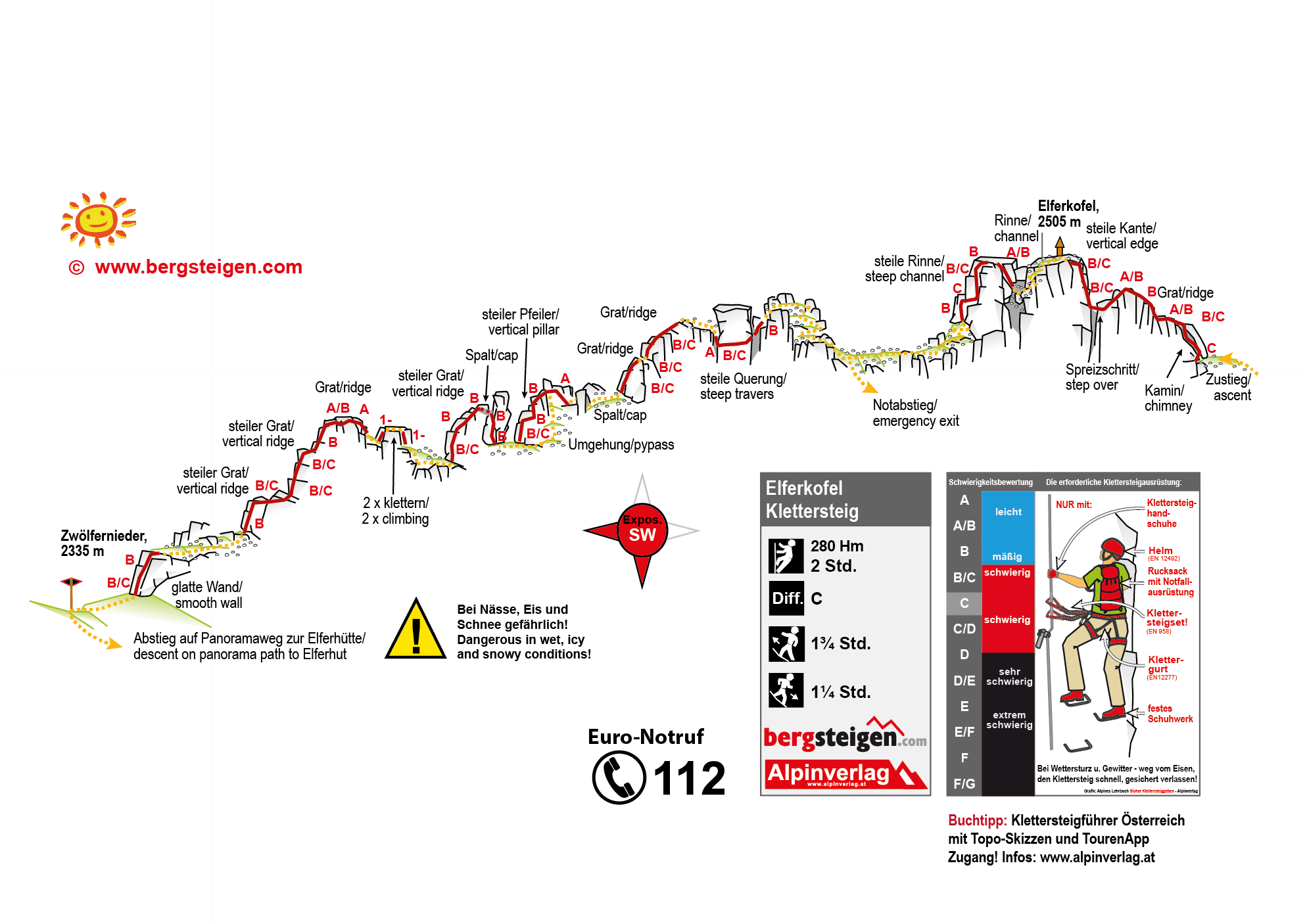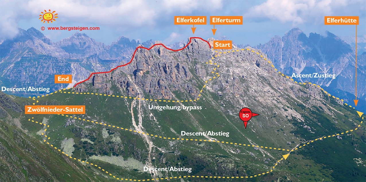 Siehe Topo. Vom Einstieg einen steilen Kamin (C) hinauf. Anschließend über den luftigen Grat zu einem interessanten Spreizschritt (B/C) und direkt an der Kante steil hinauf (B/C)) zum Elferkofel. Vom Gipfel gestuft (A/B) und durch eine Rinnen (C) hinunter. Nach dem Gehgelände (Notausstieg nach Südosten) folgt eine Querung (B/C) zum Sattel. Eine Gratpassage und Türme (bis B/C) führen zu einem Spalt und einer Stufe (B und B/C). Von dem Sattel im Gehgelände (B und kurz 1) auf den Grat (zuerst A/B, dann A) und über mehrere Stufen (B bis B/C) zum Ausstieg beim Zwölfnieder-Sattel.
