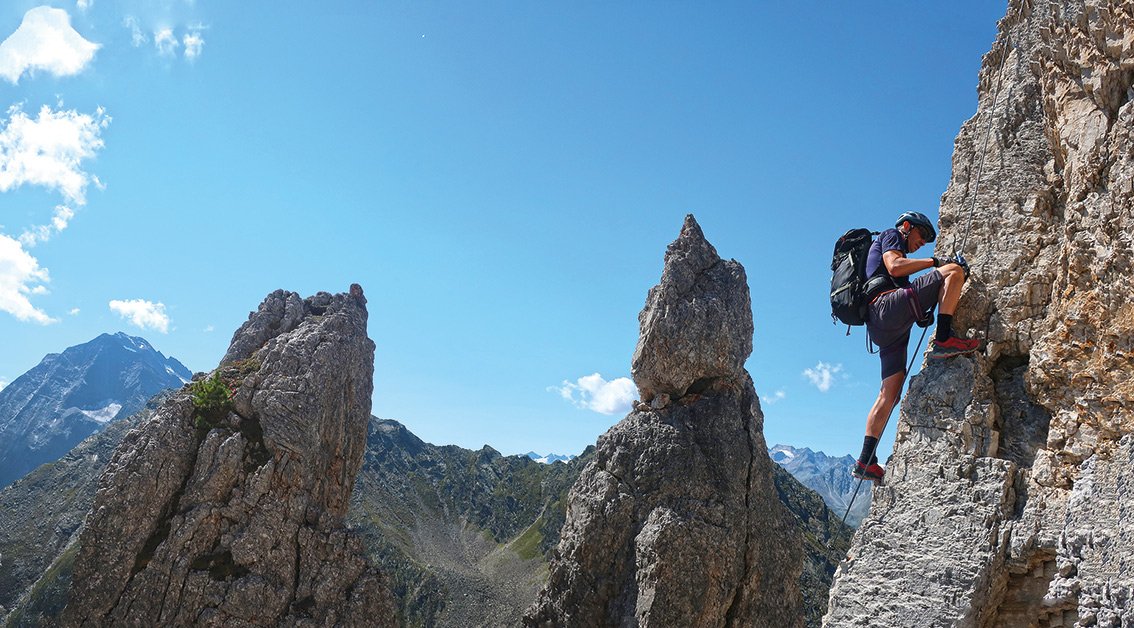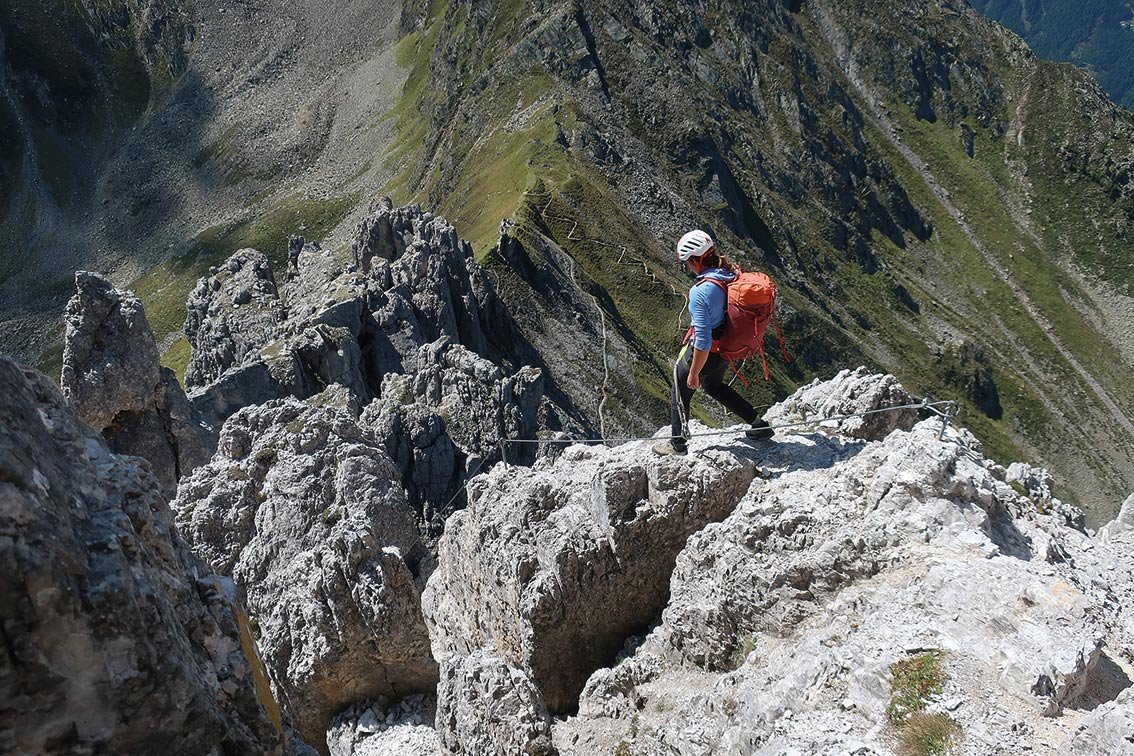 Der Elferkofel - Klettersteig ist eine etwa 1 km lange Überschreitung der Elferspitze mit unzähligen kleinen Türmen und Gratstellen. Immer auf und ab, ein wirklich schönes Erlebnis. Die Kletterei zwischen den Türmchen ist immer recht abwechslungsreich, es gibt, steile Gratpassagen, enge Spalten und kleine, ausgesetzte Querungen. Oft kann man von den einzelnen Türmen die schöne Aussicht zum Habicht genießen. Insgesamt ein sehr schöner Gratklettersteig, bei dem man die Stubaier Alpen voll genießen kann.