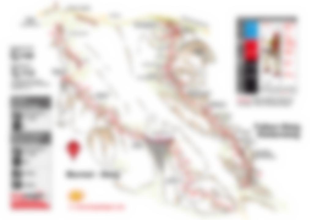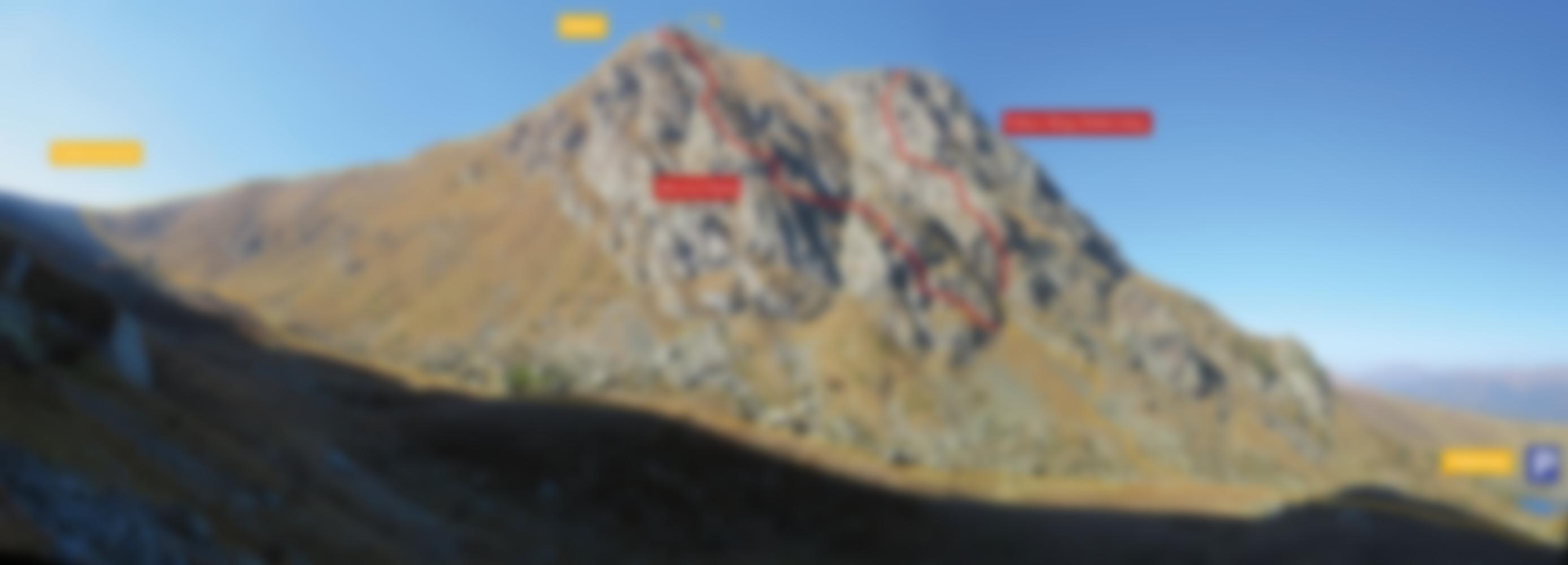 Vom Einstieg eine grasige Rinne (A/B, Stelle B/C) zu einer Verschneidung aufsteigen. Die steile überdachte Verschneidung (C/D) empor und auf einem Grasband nach links queren (A bis A/B). Die Querung wird von zwei steilen Aufschwüngen (B/C und C) unterbrochen. Nach dem Steigbuch folgt ein gestufter Steilaufschwung (C). Eine ansteigende Querung (B/C) endet in einem Überhang (C/D). Sehr luftig geht es auf einer Rampe (C/D) nach rechts an eine Kante. Im Gras (A) erreicht man die Westseite eines Felssporns und quert ansteigend (A/B) zur Seilbrücke (B). Über diese zu einer kurzen überhängenden Abkletterstelle (D). Im leichten Gelände (A/B) wird der Ausstieg erreicht.