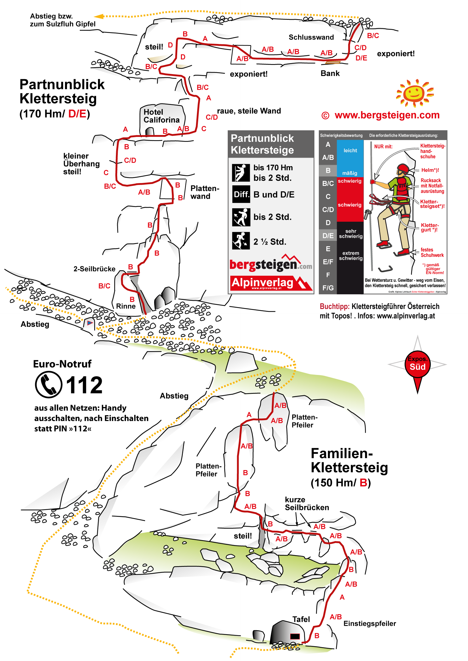 Vom Parkplatz Nr. 6 auf dem markierten Weg zum Partnunsee, am linken Seeufer entlang links der Normalweeg zur Sultzfluh hinauf zu den Wänden führt. Bald weist eine blaue Klettersteigtafel dem Weg zum Einstieg des Familienklettersteiges. 1:30 ab P6.