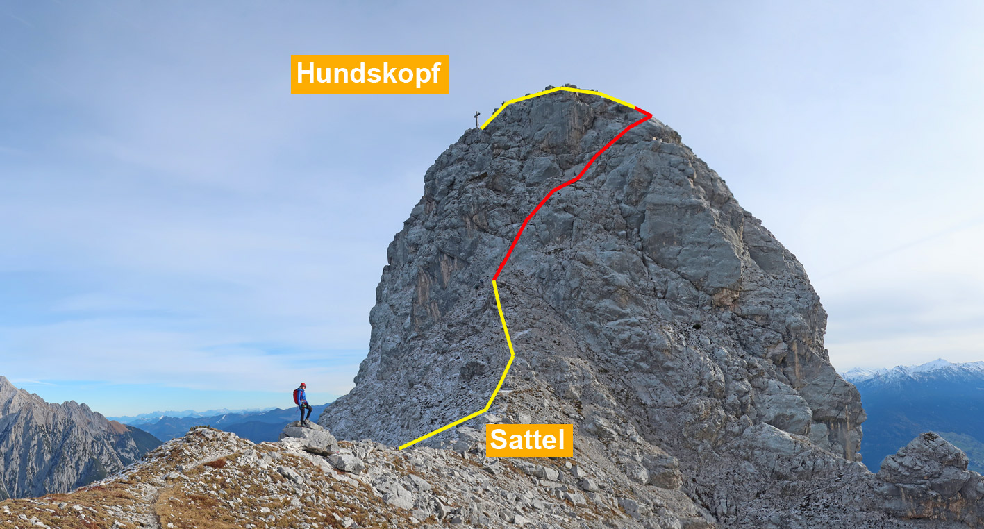 Siehe Topo. Man quert zuerst unterhalb der Nordabstürze (A) und erreicht einen kleinen Sattel. Dort weiter bis in den Sattel an der Westseite des Hundskopfes. Dort dann der roten Punktmarkierung auf dem Grat in Richtung Hundskopf folgen bis zum zu den Stahlseilen kommt. Zwei kurze Steilstufen (B) und eine Querung (A/B) und schon steht man auf dem Gipfelplateau und geht zum Kreuz.