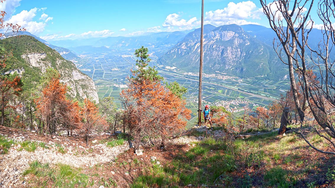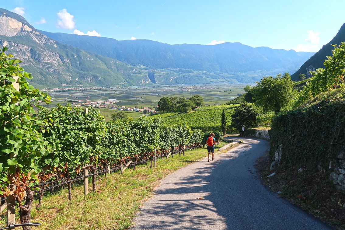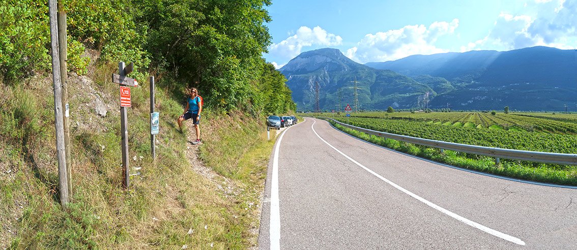 Im Zentrum von Margreid nur kurz bergwärts, dann im Ort links auf Nebenstraßen in Richtung Süden. Später entweder auf der Straße oder auf Wirtschaftswegen in den Weinbergen bis um eine Geländekante. Dort beginnt der Zustieg zum Klettersteig (Wegweiser).