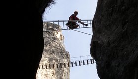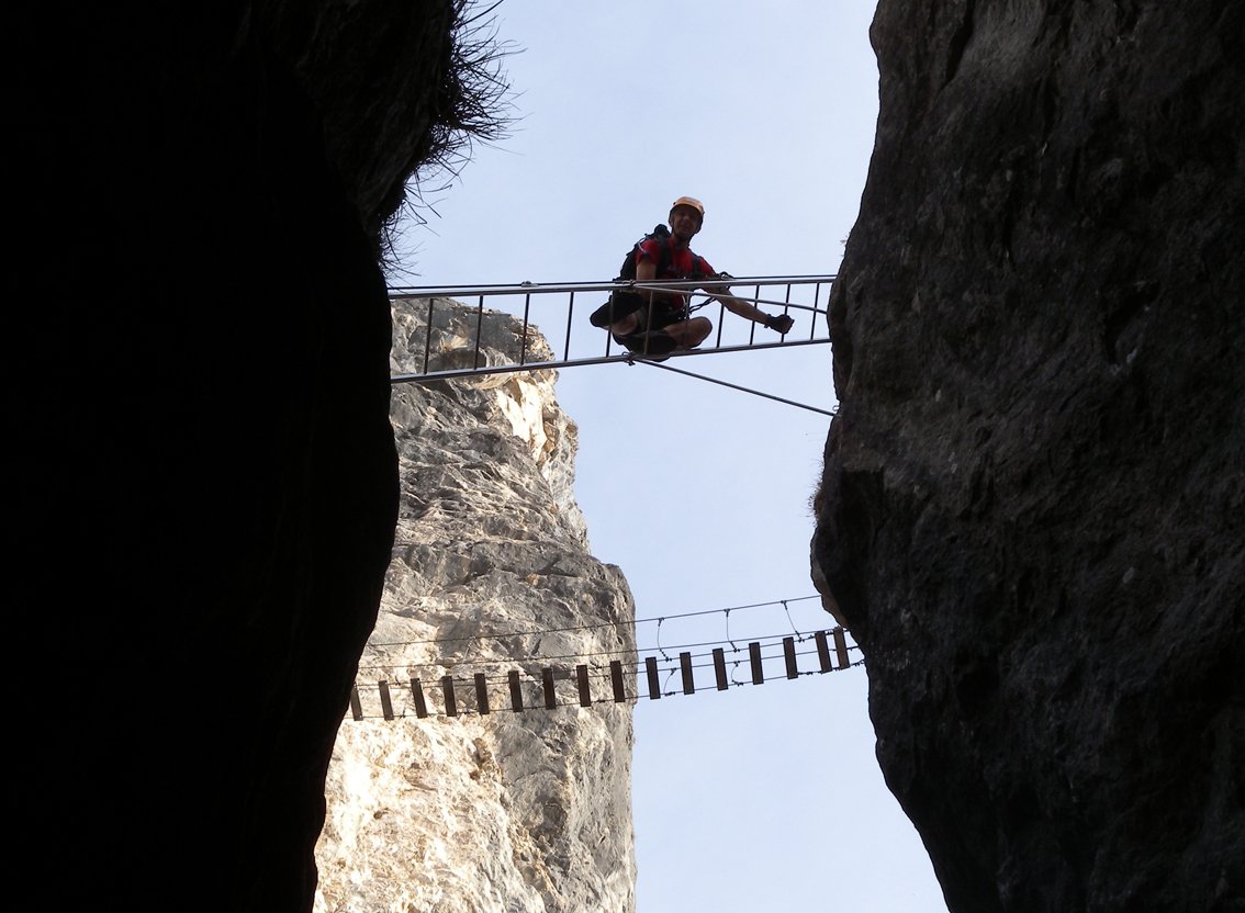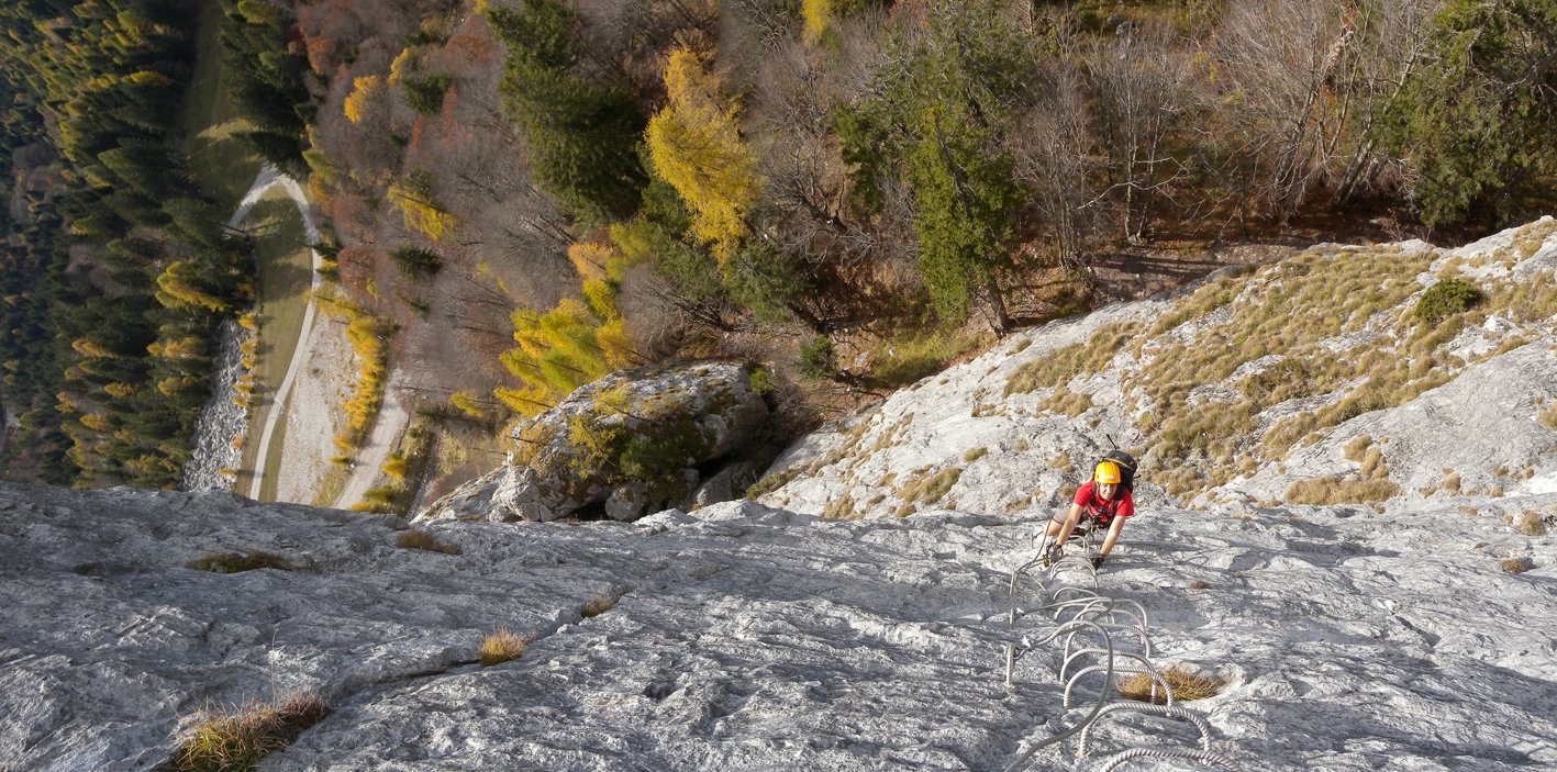 Ein Sportklettersteig wie aus dem Bilderbuch - besser hätte man eine sportliche Ferrata nicht anlegen können! Der 300 m lange Steig hat - wenn man den Sessellift nimmt - einen kurzen Zustieg, dann einen leichten Actionteil mit einem Spalt, einer Spannleiter und einer 30 m hohen Hängebrücke. Danach folgt das furiose Vertikalfinale durch die senkrechte Steilwand. Die Tour ist mit C/D (eine Stelle D) nicht allzu schwer, etwas Kraftausdauer sollte man aber schon haben, damit man an der lange Steilwand auch die perfekte Aussicht auf die Felstürme der Dolomiti d’Oltre Piave genießen kann.