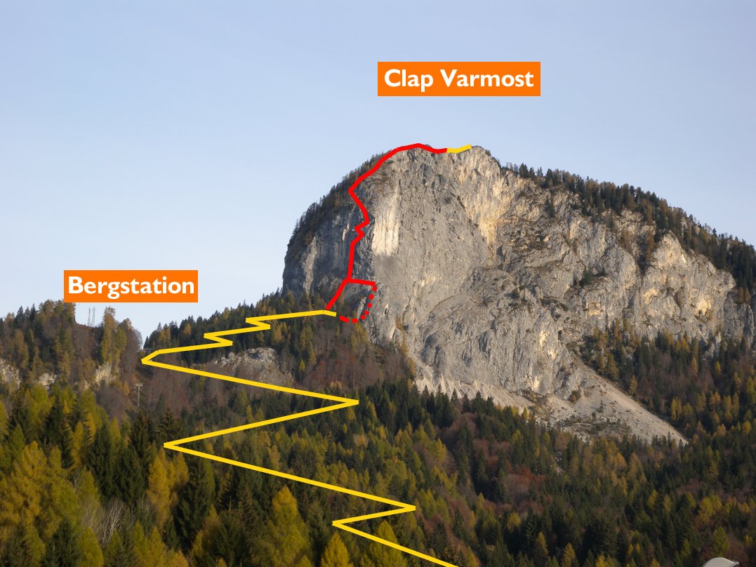 Auf der Forststraße durch das Skigebiet zur Mittelstation der Sessellifte aufsteigen. Rechts von der Mittelstation beginnt der rot markierte Pfad zum Einstieg des Klettersteiges (ab der Bergstation 15 Min.).