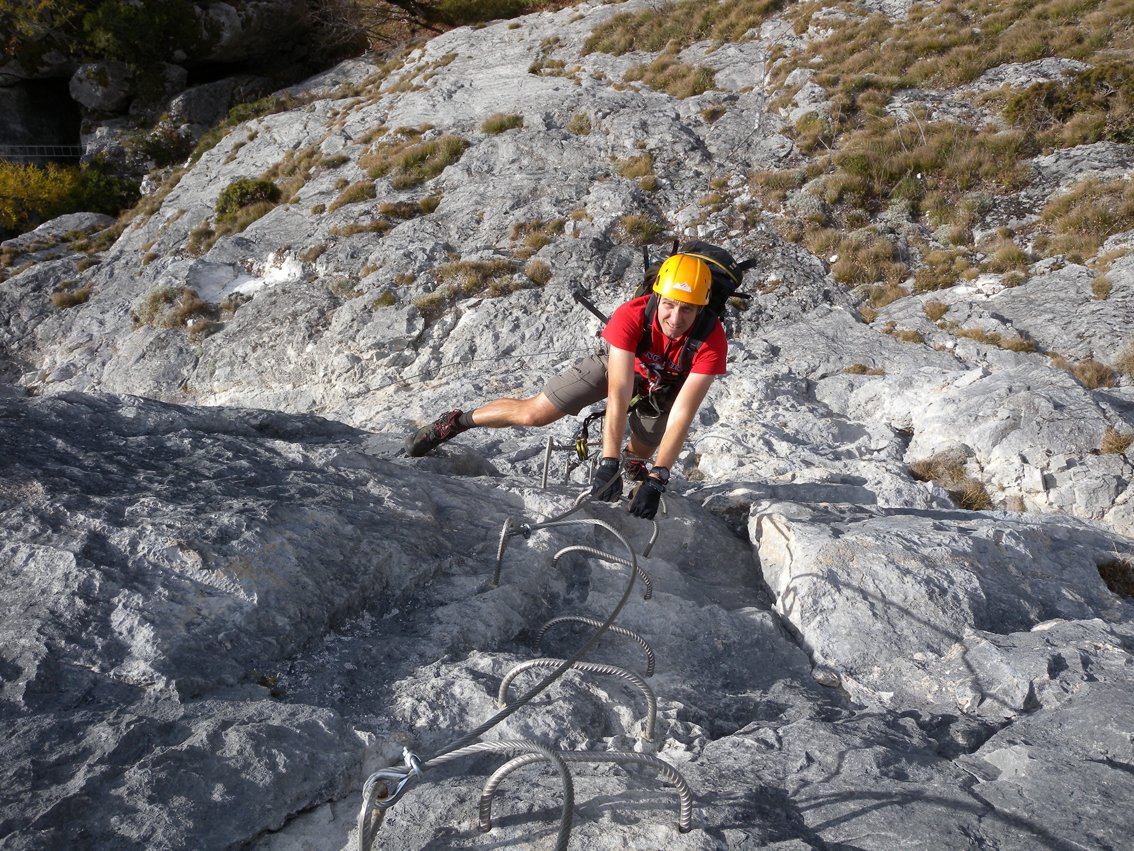 Komplette Klettersteigausrüstung und Helm - für Schwächere ist ein Sicherungsseil sinnvoll.