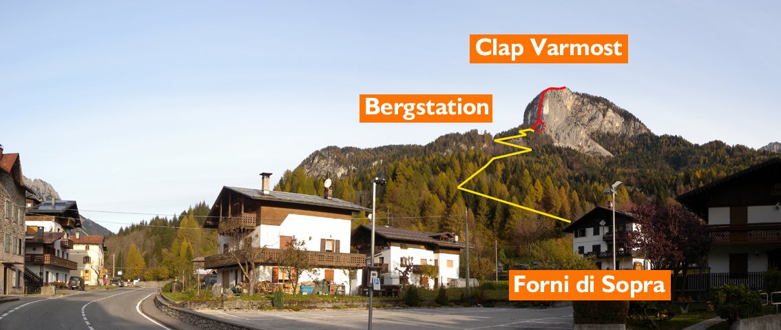 Von Osten: Auf der A23 bis zur Ausfahrt Tolmezzo und weiter auf der SS52 bis Forni di Sopra. Am Ortsende rechts abbiegen und der steilen Straße bis zum kleinen Parkplatz beim Fahrverbot in Chianeit folgen.