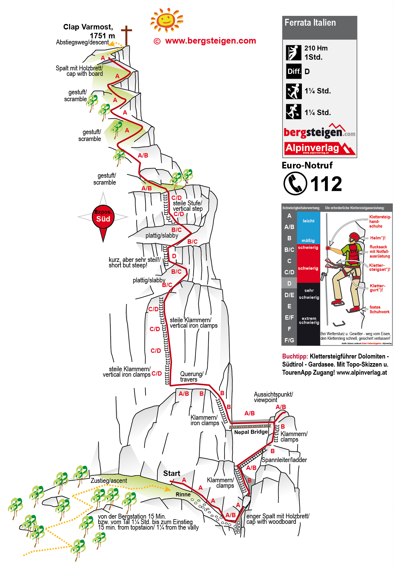 Siehe Topo. Vom Einstieg nicht gerade die Stahlseile hinauf (das ist der Notabstieg)! Man geht nach rechts, steigt zu einem Holzbrett ab (A/B) bei einem engen Spalt (A). Links an Klammern (B) aufwärts zur ersten Leiter (A/B), dann an Klammern (B) auf einen Turm (Aussichtspunkt). Von dort über die Hängebrücke (A/B) zur Hauptwand und mithilfe von Klammern (B) auf ein Band, dann nach links (B) bis zum Beginn der Gipfelwand. Die Gipfelwand ist durchgehend steil (C/D) und verlangt Ausdauerkraft. Nach einer Platte (B/C) kommt eine kurze Steilstufe (D). Nach einer weiteren Platte (B/C) und einer steilen Klammernpassage (C/D) ist das Ende der Schwierigkeiten erreicht. Gestuft (Stellen bis A/B) folgt man dem Stahlseil bis kurz vor das Gipfelkreuz (unbedingt beim Seil bleiben!).