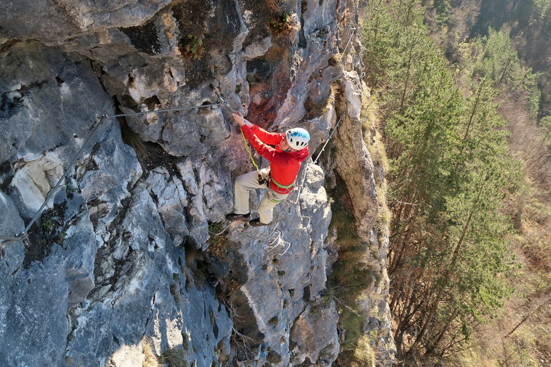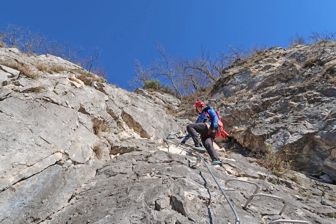 Achtung: Die drei Teile des schweren Klettersteiges die das Tetto dei salbanei sind nicht zu unterschätzen - man braucht viel Kraft um dort solide hinaufzu klettern! Das Tetto dei salbanei nur für Kletterer mit Erfahrung im Schwierigkeitsgrad UIAA 7- (franz. 6a+)!