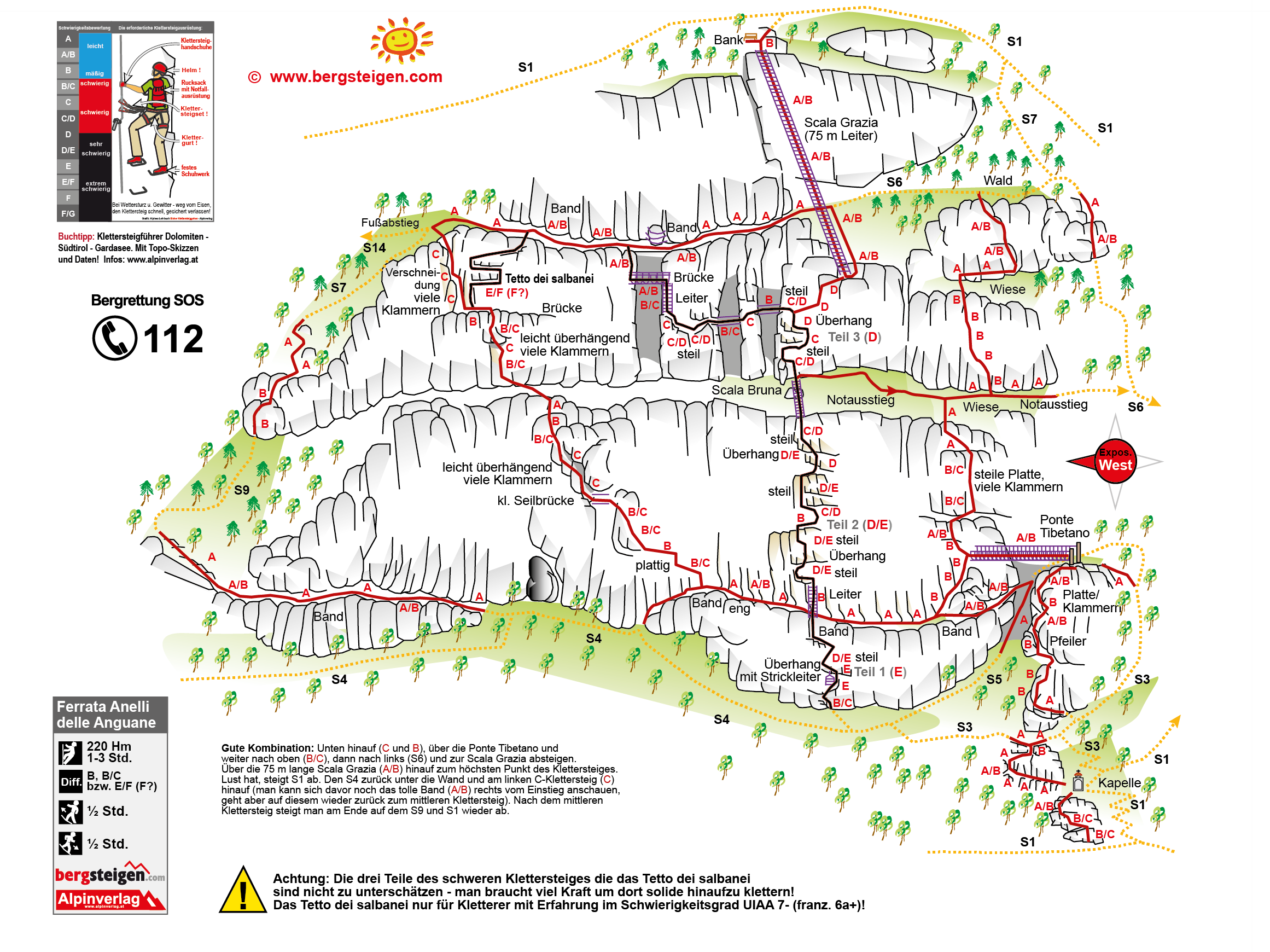 Siehe Topo. Unten hinauf (C und B), über die Ponte Tibetano und weiter nach oben (B/C), dann nach links (S6) und zur Scala Grazia absteigen. Über die 75 m lange Scala Grazia (A/B, kurz B) hinauf zum höchsten Punkt des Klettersteiges. Lust hat, steigt S1 ab. Den S4 zurück unter die Wand und am linken C-Klettersteig (C) hinauf (man kann sich davor noch das tolle Band (A/B) rechts vom Einstieg anschauen, geht aber auf diesem wieder zurück zum mittleren Klettersteig). Nach dem mittleren Klettersteig steigt man am Ende auf dem S9 und S1 wieder ab. Für Liebhaber extremer Schwierigkeiten gibt es im Mittelteil einen E-Klettersteig und links oben das sog. Tetto dell Salbai (E/F, evtl. F).