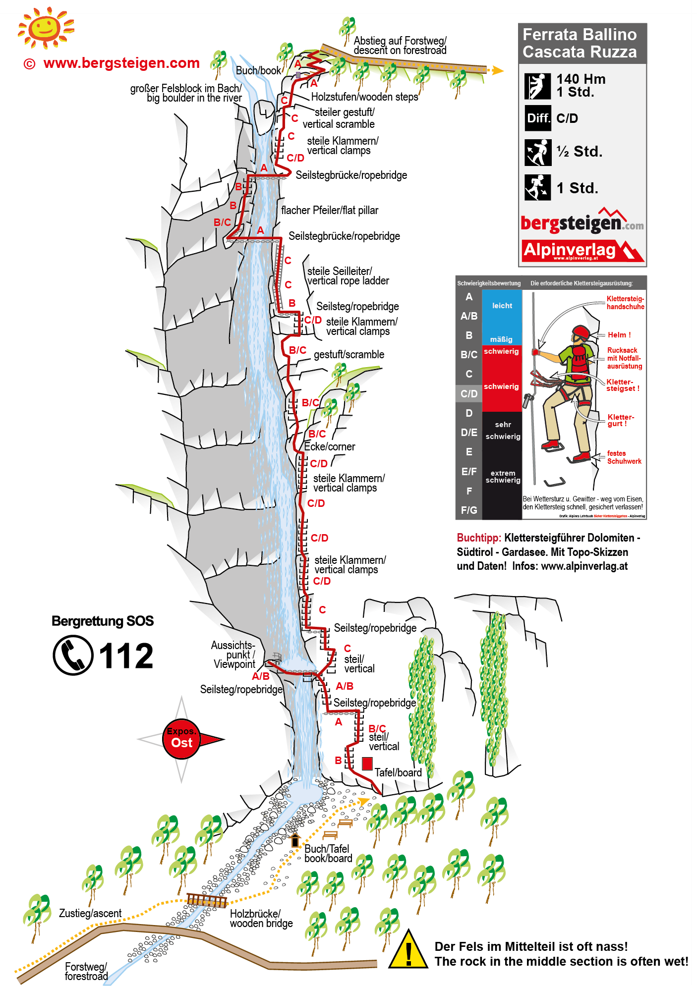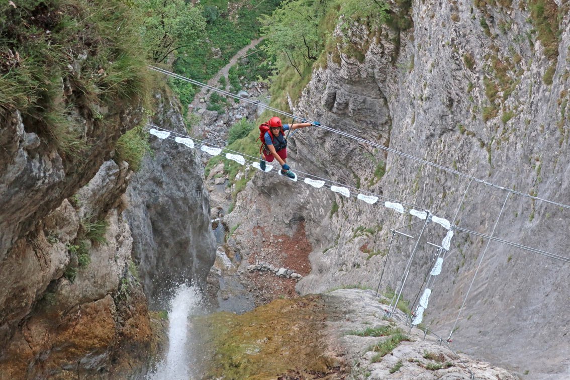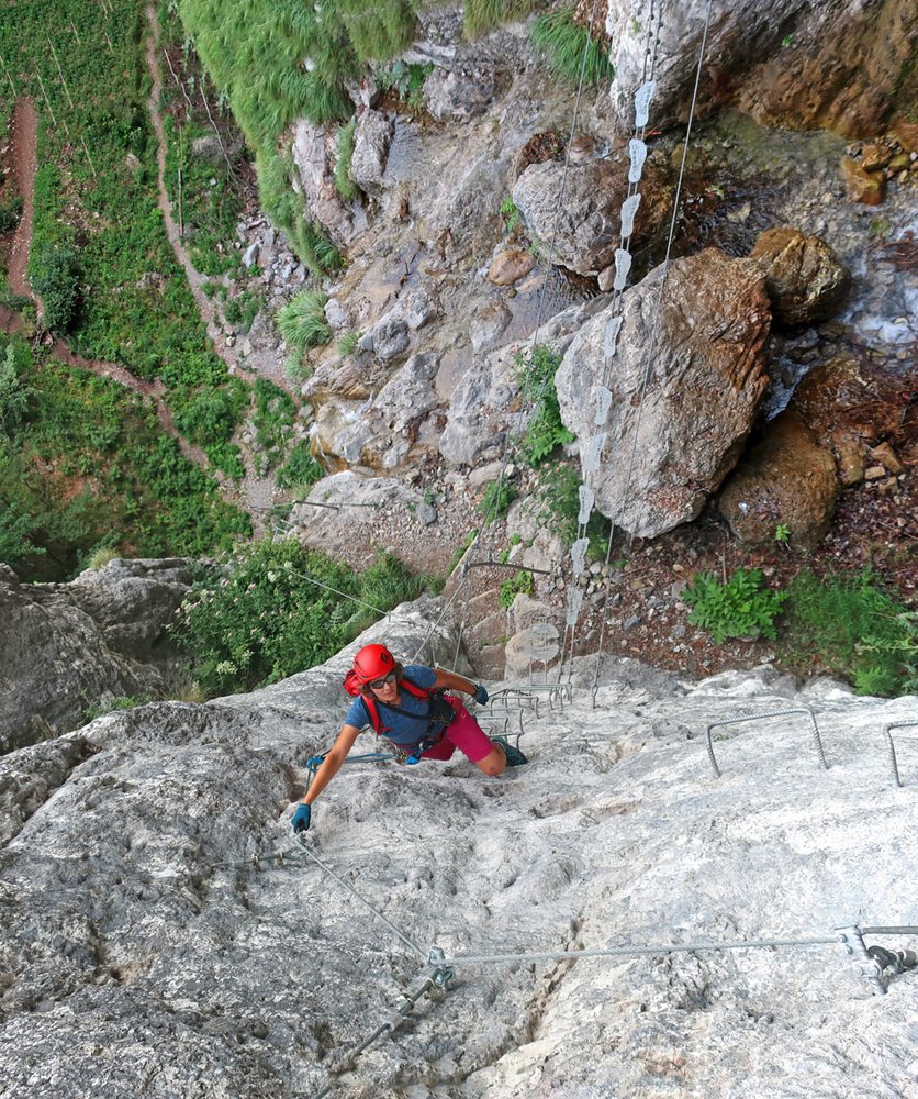 Toller Action-Klettersteig, man klettert steil und ausgesetzt im Nahbereich eines Wasserfalls! Die ursprünglich nur bis zum Aussichtspunkt (im Kessel) verlaufende Ferrata wurde im Sommer 2019 verlängert. Steile, mittelschwere, aber recht anhaltende Vertikalpassagen, oben zwei Seilbrücken und der steile Ausstieg bei einem riesigen Felsblock. Wirklich ein sehr schöner Klettersteig, der das Ferrata-Angebot um den Gardasee perfekt bereichert!