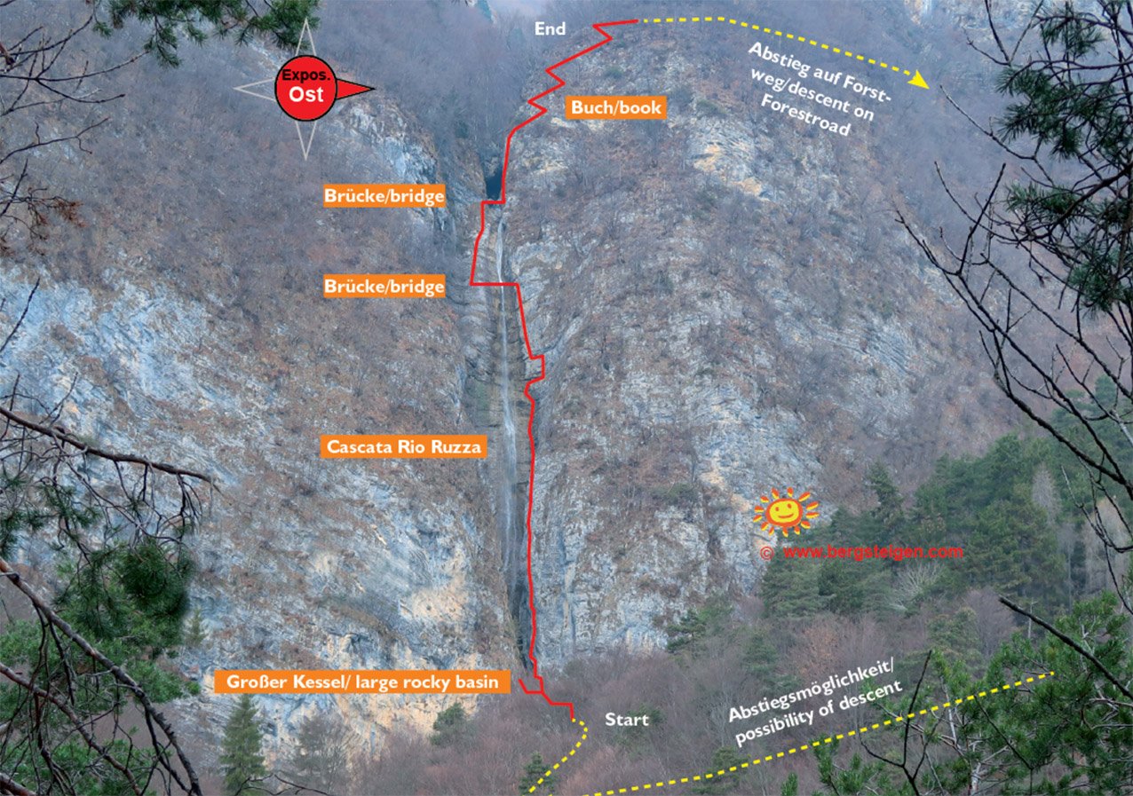 Vom Ausstieg zum Forstweg. Dort rechts auf der Forststraße abwärts. Oberhalb der Straße zweigt man dann auf einem Wanderweg nach Ballino ab. Alternativ kann man bei einer Abzweigung wieder zurück in Richtung Wasserfall (Einstieg des Klettersteiges) und unterhalb von diesem auf dem schon bekannten Zustiegsweg zurück nach Ballino.