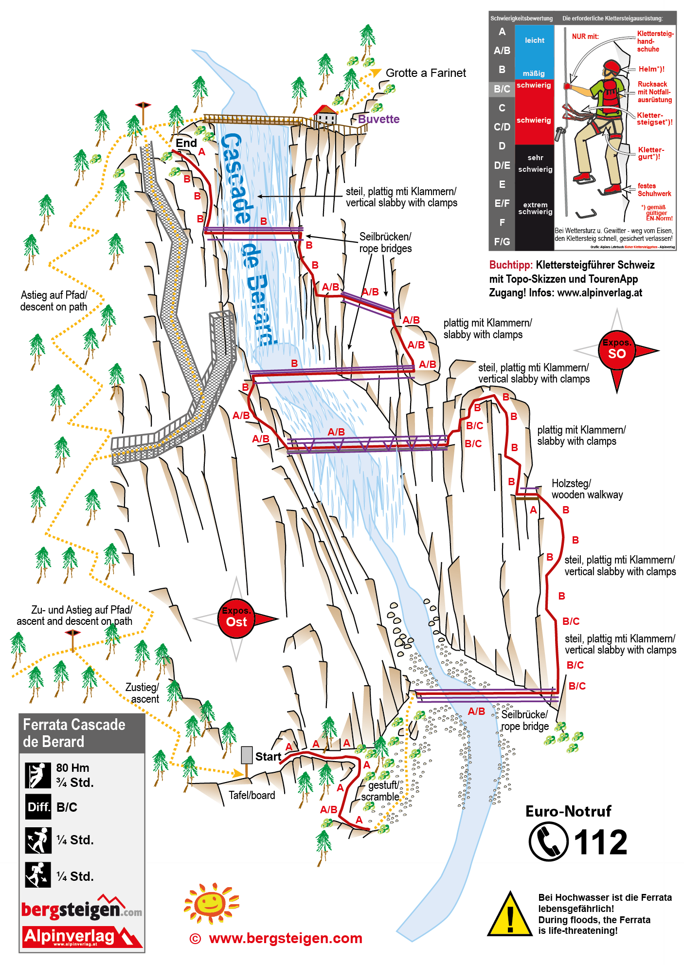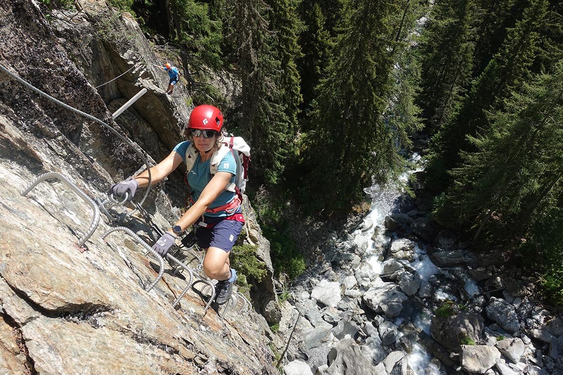 Über fünf Brücken musst du gehen - so könnte man die Ferrata Cascade de Berard kurz auf den Punkt bringen. Man ist dabei immer oberhalb eines tosenden Wildbaches unterwegs und kommt final einem Wasserfall gefährlich nahe, dieser Umstand macht diesen Klettersteig zu einer wirklich gelungenen Ferratatour! Wer Zeit und Lust hat, kann die Ferrata mit einer Wanderung in das malerische Reserve naturelle du vallon de Berad verbinden, der Wanderweg führt sogar bis auf den 3096 Meter hohen Mont Buet hinauf.