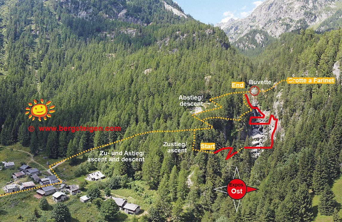 Vom Ende auf dem Weg RW12 wieder zum Parkplatz in Le Buet. Wer will, kann sich am Ausstieg noch die Grotte a Farinet (hinter der Jausenstation Buvette) anschauen, zu viel erwarten darf man sich aber nicht.
