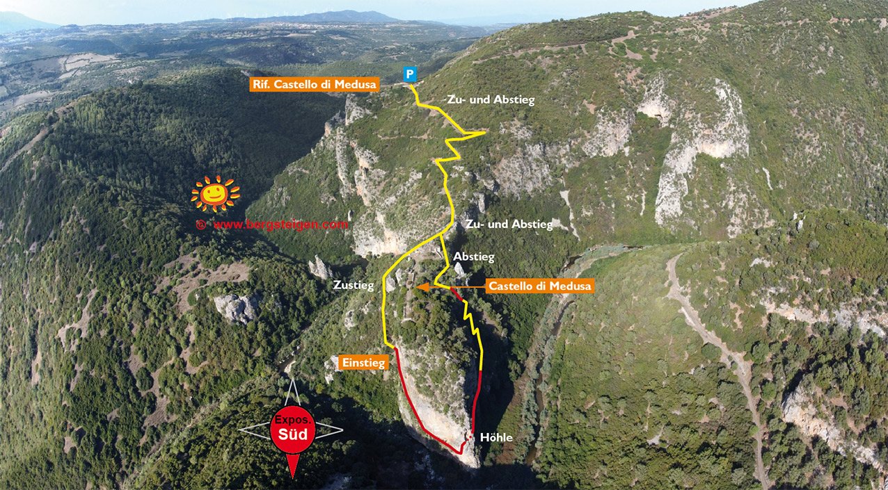 Vom Parkplatz auf dem Schotterweg, später über Stufen hinunter zum Castello di Medusa. Bevor man zur Burg kommt, zweigt rechts ein Pfad ab. Diesem folgt man etwas abwärts (an einem Felsturm unterhalb vorbei), quert dann aber links zum Wandfuß mit dem Einstieg (bei rötlichem Fels).