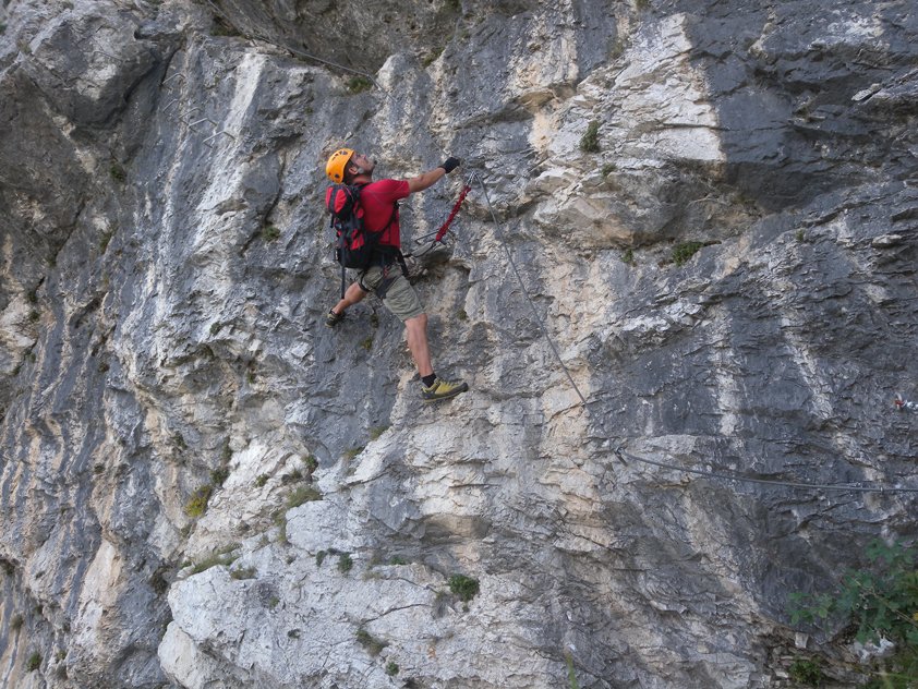 Kompl. Klettersteigausrüstung und Helm – für Schwächere ist die Mitnahme eines Sicherungsseils anzuraten.