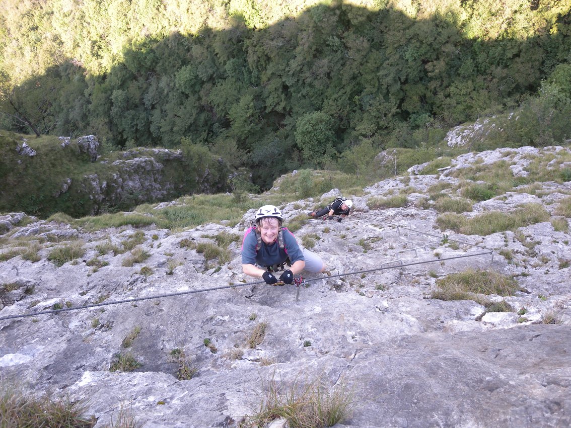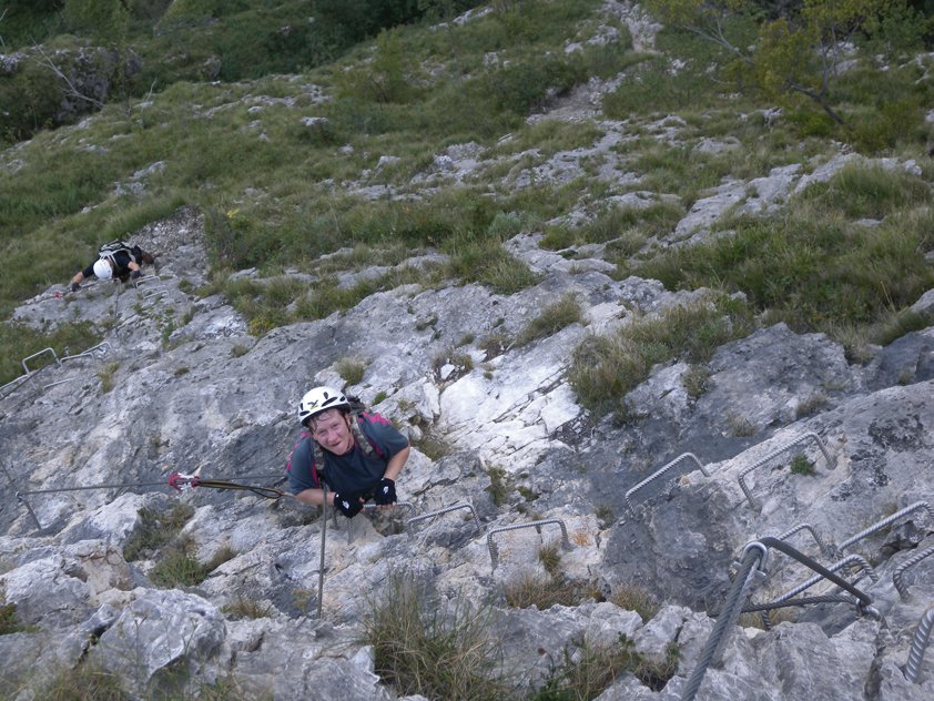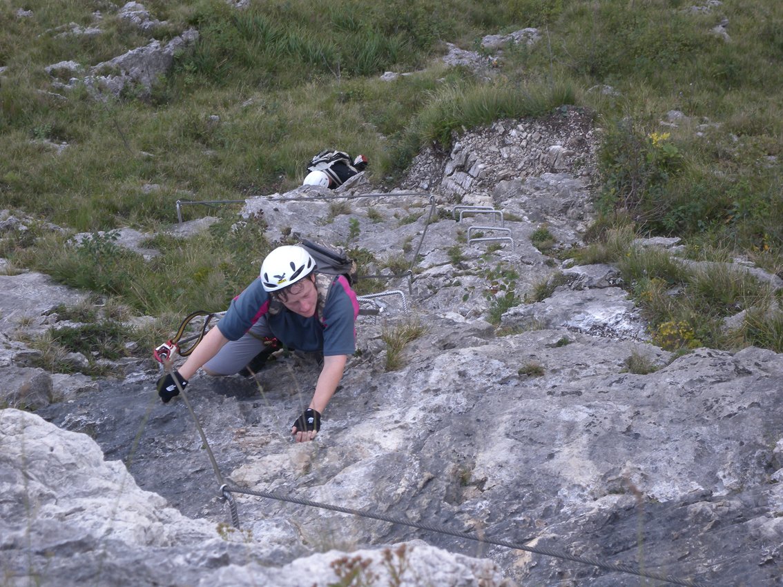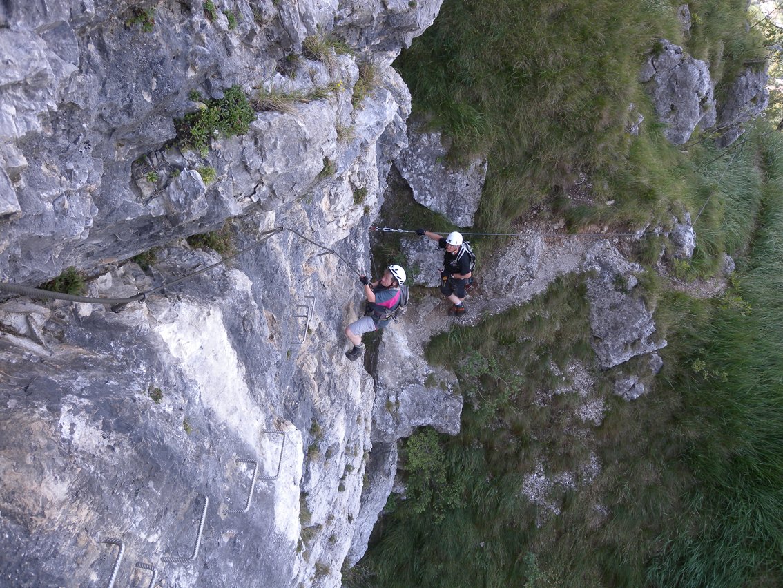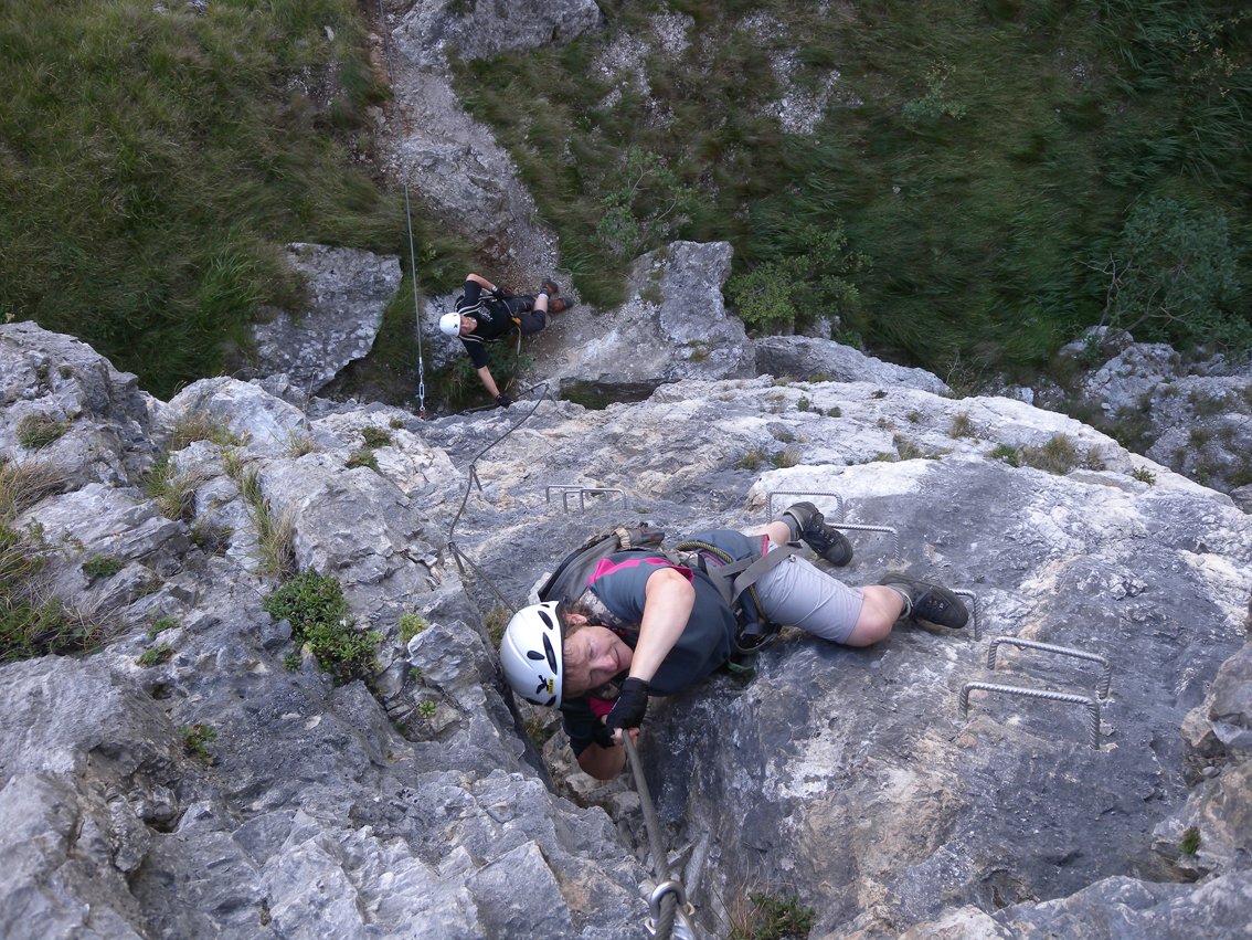 Teil 1: Auf einem Band zum ersten Steilstück, dort heißt es gleich einmal kurz durchbeißen (D) und schon steht man im leichteren Gelände (B). In einer Rinne hinauf (C, etwas brüchig) zu den Schrofen. Es folgt eine steile Querung die nach oben hin immer schwerer wird (C/D). Knapp vor der rettenden Geländekante wird es kurz leicht überhängend (D). Auf dem Grasabsatz wird meist ausgiebig gerastet (nicht vom Seil entfernen), wo man einen schönen Ausblick auf den See genießen kann. Danach geht es einfach (A) mehr oder weniger zu Fuß zu einer Felswand.