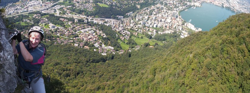 Eine knackige Nordwand-Ferrata hoch über dem Luganosee! Von „schwerster Klettersteig der Schweiz“ und von „K5+“ war die Rede. Schon unter dem Einstieg stehend denkt man sich - die Wand schaut gar nicht so schwer aus. Genau so ist es dann auch, kurze knackige Vertikalpassagen wechseln mit leichten Verschnaufmetern ab. Der Gipfel des San Salvatore ist aber nicht nur Anziehungspunkt für Pilger (Hospiz der Erzbruderschaft) und Klettersteiggehern, sondern auch ein gewaltiger Blitzmagnet und daher seit Jahren Standort der Blitzforschung. Die Blitze werden jetzt von den dicken Stahlseilen des Klettersteiges angezogen, es ist daher ratsam, bei herannahendem Gewitter den Steig schleunigst zu verlassen.