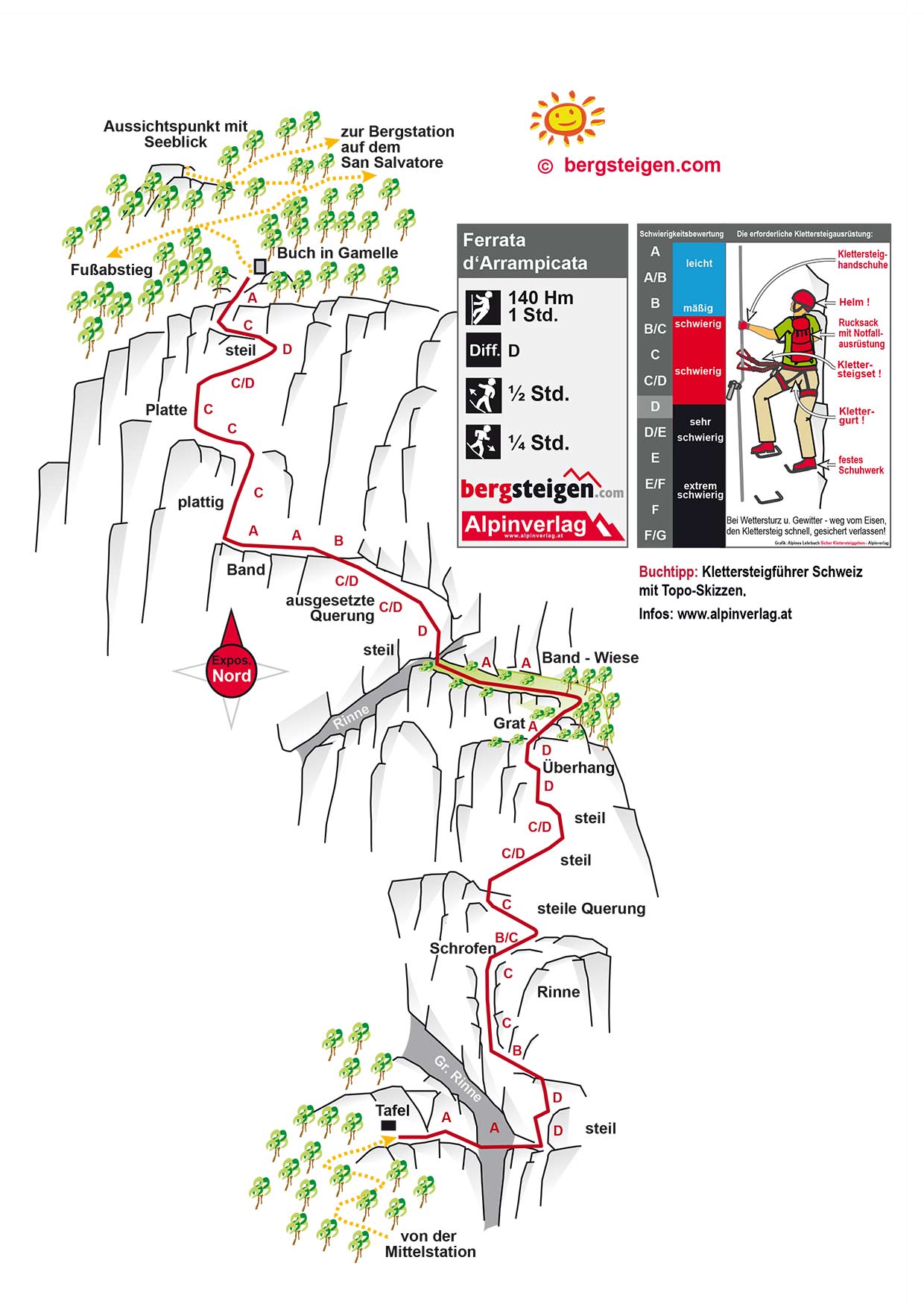 Der Klettersteig mit D ist nicht extrem schwierig, sollte aber auch nicht auf die leichte Schulter genommen werden - etwas Armkraft ist nötig. Nach stärkeren Regenfällen und bei Nässe sollte man die Tour meiden - tlw. erdige Passagen in der Wand, auch auf dem Zustiegsweg wird es ungemütlich. Vorsicht, oft Steinschlag im ersten Teil. Info Seilbahn: www.montesansalvatore.ch