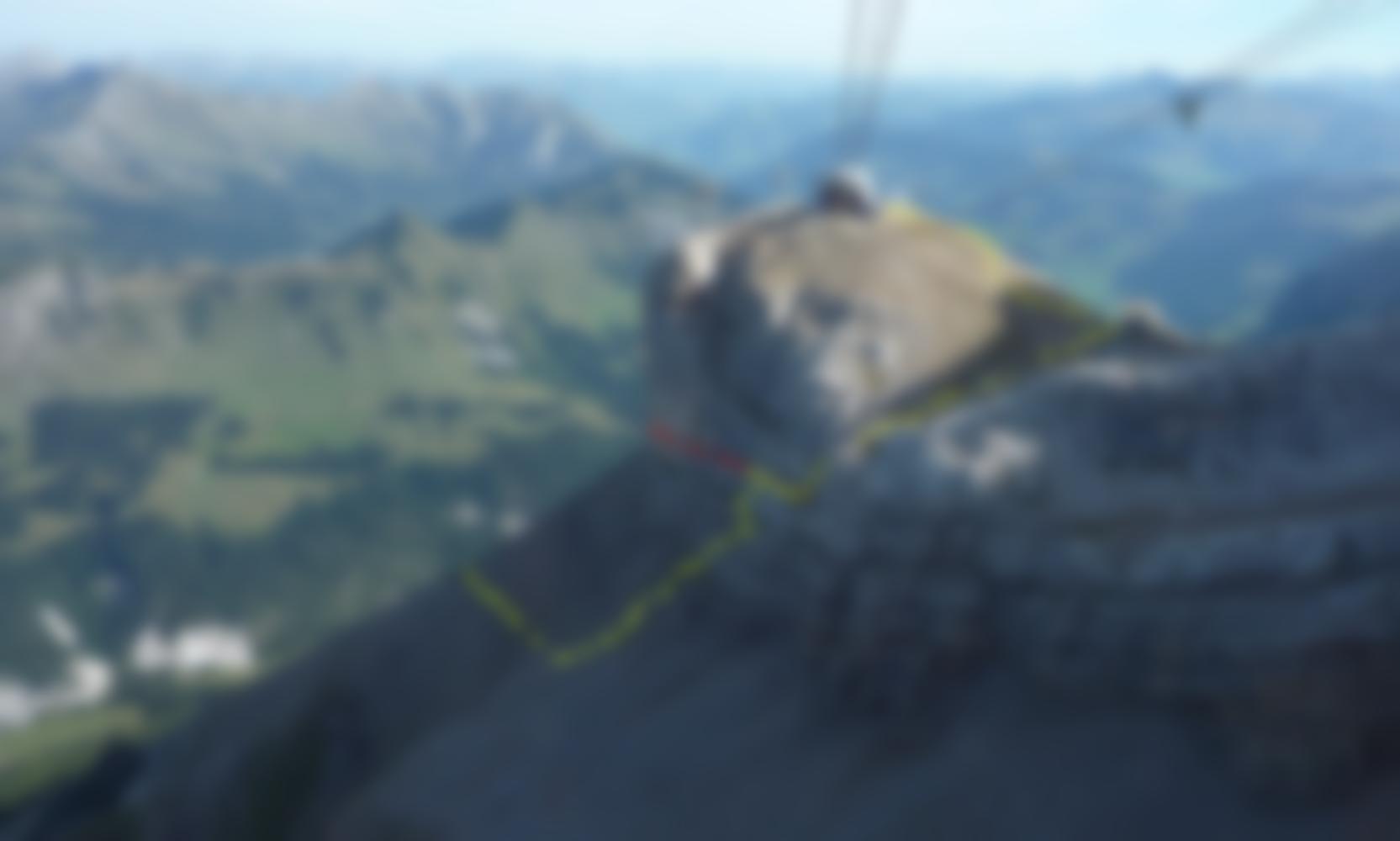Anfangs folgt man gemütlich (A) einem schmalen Band zu einer Unterbrechungsstelle (B/C), auf die ein kurzer Anstieg folgt. Dann geht es steil bergab (D) auf das darunterliegende Band, auf diesem wieder gemütlich (A u. B) bis zum nächsten Abstieg (B/C). Dort kann man auch (B/C) in Notfällen ganz zum Wandfuß absteigen. Die Route folgt aber kurz dem Band bis zu einem markanten Pfeiler, der schwierig (C/D) auf das nächste Band hinaufführt. Auf diesem lange leicht, waagrecht und stellenweise unterhalb kleiner Dächer bis zu einem Holzbalken (kurz B/C). Danach dem Band um die Ecke zu einem gewaltigen Plattenpanzer folgen. Mitten durch die leicht überhängenden Platten (D und C/D) hinauf und nach links zur Headwall. Dort muss man noch einmal (C/D) richtig zupacken, bis man nach ca. 800 Metern wieder das Gipfelplateau des Tête aux Chamois erreicht.