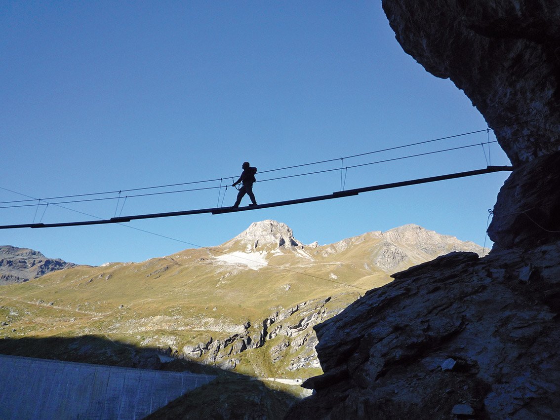 Es ist schon ein mulmiges Gefühl direkt unter der 148 m hohen Bogenstaumauer aus dem Auto bzw. dem Bus zu steigen, insbesondere wenn man weiß, dass von der anderen Seite ein 2,4 km langer Stausee mit 77 Mio. m³ Wasser auf die Mauer drückt. Umso rascher erreicht man den Einstieg und schlängelt sich im ersten Teil bis zur Hängebrücke hinauf. Dort geht man zumindest für ein paar Fotos auf die ca. 80 Meter lange Brücke und legt eine Rast ein, denn was einem auf den nächsten Metern erwartet, lässt sich problemlos in die Rubrik Ferrata-Extrem einordnen. Enorm überhängend und steil zieht die Route zur Gitè du Lac de Moiry hinauf. Wer sich dem Überhang nicht gewachsen fühlt, steigt über die Hängebrücke aus. Die Tyrolienne ist nur mit Bergführer erlaubt und der dahinterliegende Ausstieg nicht sehr lohnend.