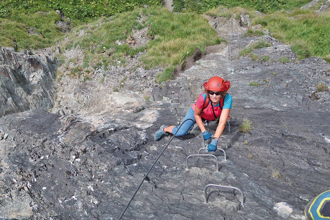 Komplette Klettersteigausrüstung, Klettersteighandschuhe und Helm; für Schwächere, die sich in die Extrem-Variante trauen ein Sicherungsseil.