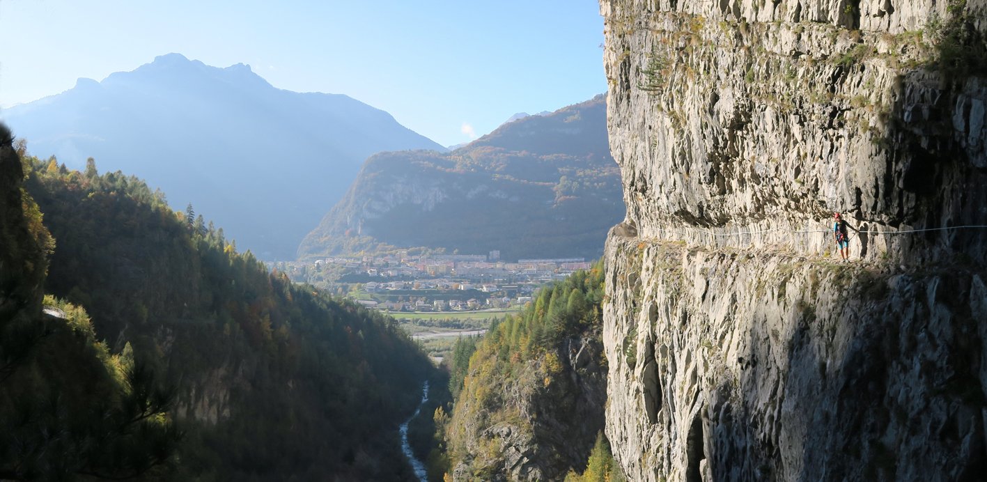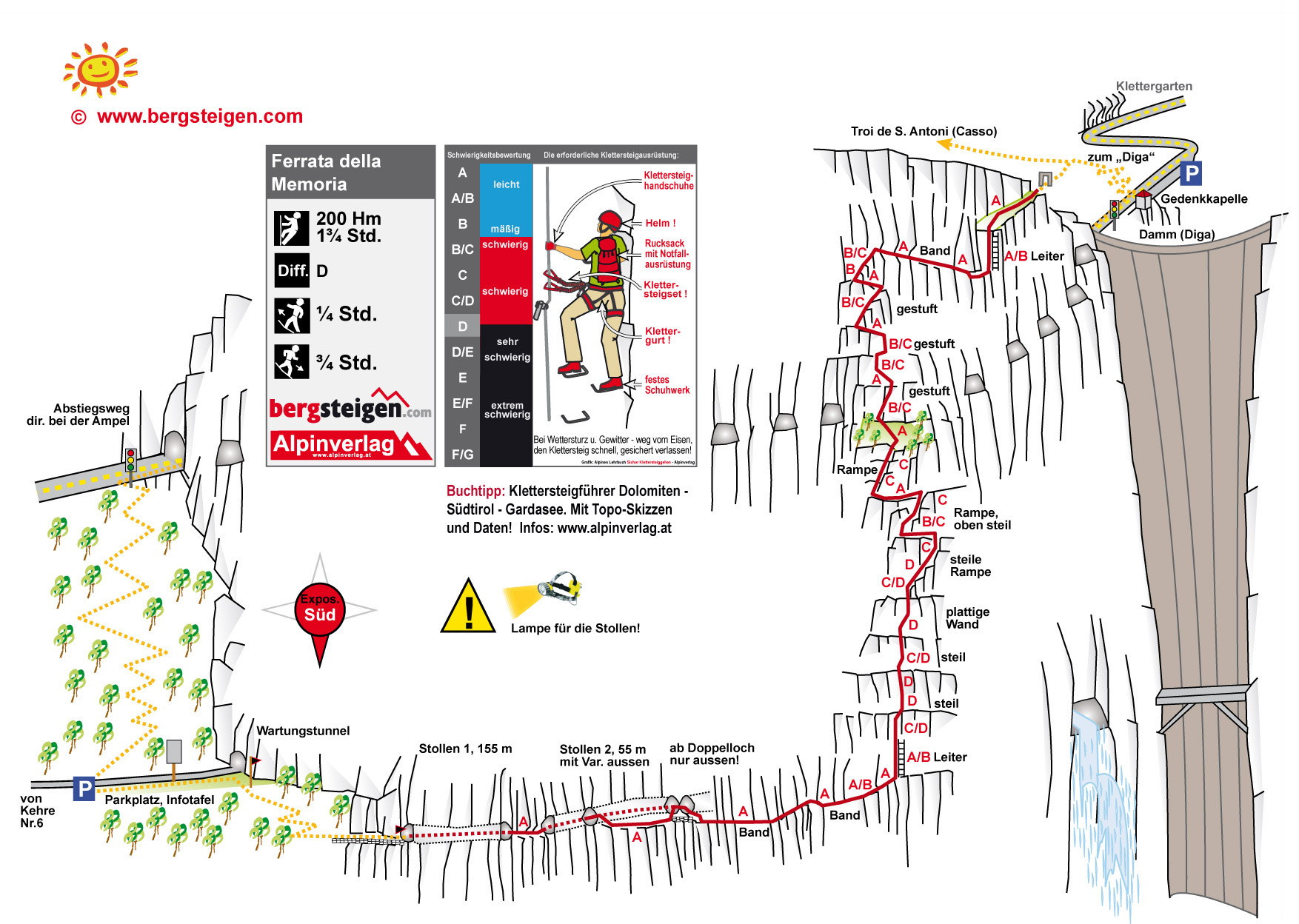 Die Ferrata della Memoria ist ein Klettersteig, dem man mit Ehrfurcht begegnen sollte! Die Route ist steil und ausgesetzt und verläuft anfangs durch zwei originelle Stollen. Im Mittelteil klettert man oberhalb eines tiefen Abgrundes, durch den die riesige Flutwelle ins Tal schoss. Ca. 2000 Menschen verloren am 9. Oktober 1963 um 22:39 Uhr ihr Leben. Große Teile der Bergflanke rutschten in den Stausee, eine gewaltige Welle wurde dadurch gebildet, die zuerst auf die andere Talseite, dann aber über die Staumauer schwappte. Durch die enge Schlucht (in welcher der Klettersteig verläuft) kam es zu einer großen Druckwelle, welche zusammen mit den danach folgenden Wassermassen den Ort Longarone komplett auslöschte. Bis auf den Kirchturm wurde alles weggespült, die Staumauer blieb zwar unbeschädigt, der See wurde aber nie wieder aufgefüllt. Der Besuch des sehr gut gemachten Klettersteiges ist lohnend, der Anblick der riesigen Staumauer - im Wissen um die Katastrophe von 1963 - aber erdrückend.