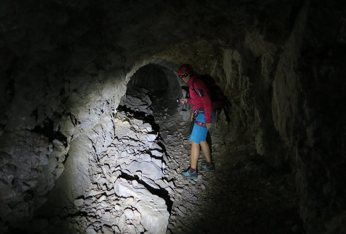 Komplette Klettersteigausrüstung, Helm und Stirnlampe für die Stollen.