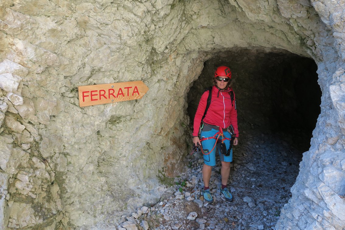 Vom Parkplatz vorbei an der Infotafel zum Tunnel, direkt vor diesem aber rechts einem Pfad abwärts folgen. Man gelangt zu einem alten Weg der zum ersten Stollen führt, dort ist der Einstieg der Ferrata.