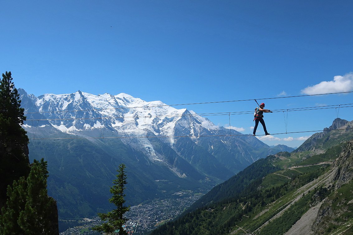Die Ferrata des Evettes ist ein Klettersteig, bei dem die Aussicht auf den Mont Blanc im Mittelpunkt der gesamten Unternehmung steht. Die wirklich gut gemachte Ferrata mit den steilen Klammern-Passagen und Seilbrücken ist quasi Nebensache, wenn man am Ende auf der 50 Meter langen Dreiseilbrücke direkt in Höhe des Mont Blanc zum Ende des Klettersteiges schwebt. Eine gut gemachte Ferrata, die man sich bei einem Chamonix-Besuch auf jeden Fall einmal anschauen sollte!