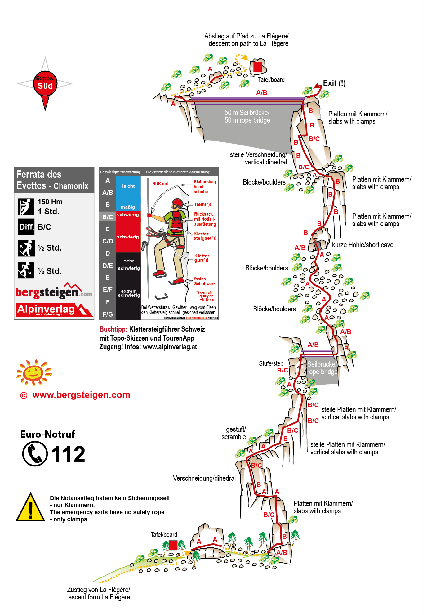 Die Exits (Notausstiege) und auch die kurzen Steilpassagen beim Abstieg sind nicht mit durchgehendem Stahlseil gesichert (nur Klammern) - mit Kindern/Jugendlichen und Unerfahrenen eventuell ein Sicherungsseil verwenden.