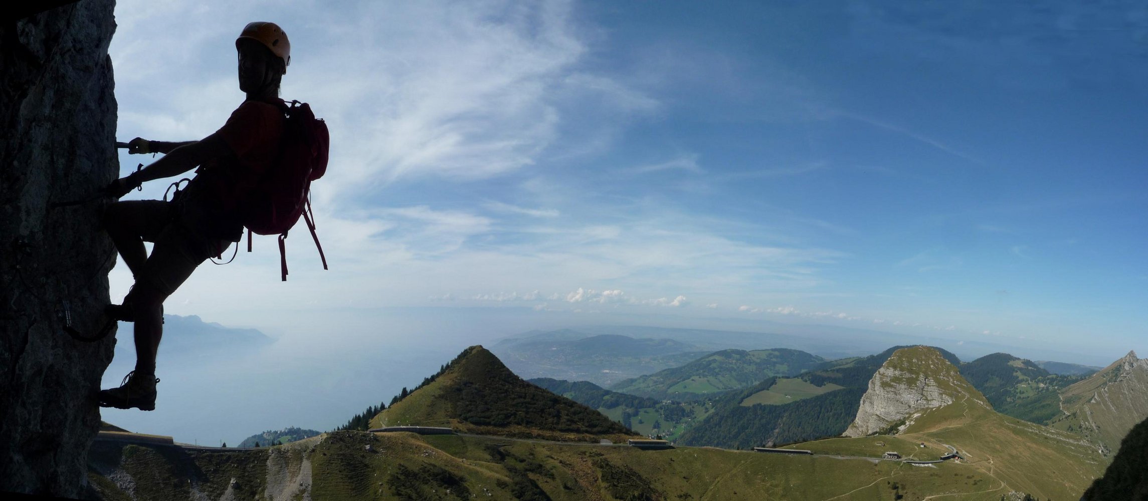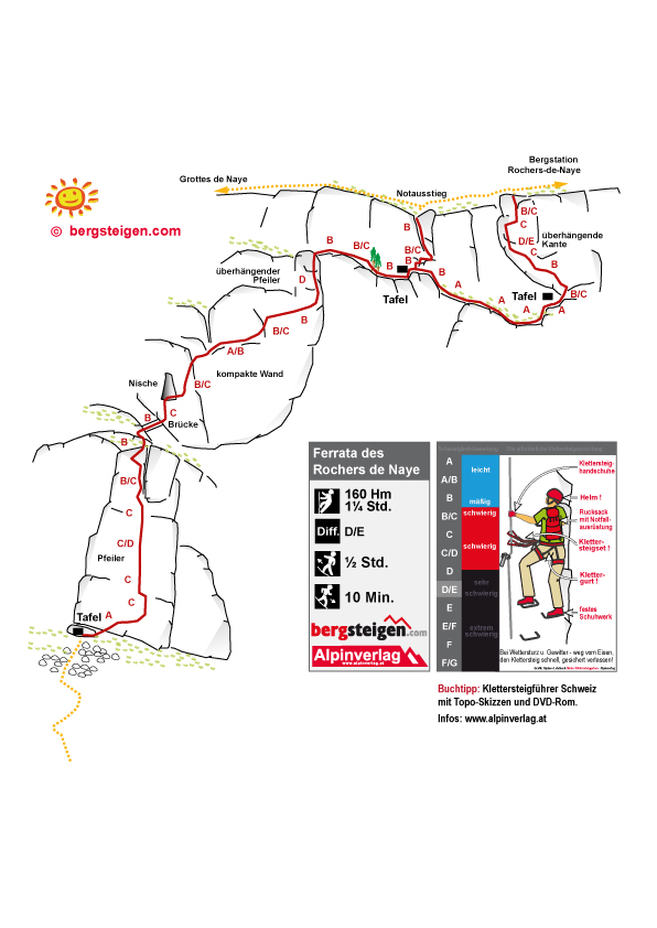 Komplette Klettersteigausrüstung, Helm und Klettersteighandschuhe, eventuell ein Sicherungsseil für schwächere Kletterer; Stirnlampe für Abstiegsvariante durch die Grottes de Naye.