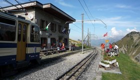 Vom Ausstieg in südwestliche Richtung queren und zum bereits gut sichtbaren Bahnhof Rochers de Naye (1968 m, Endstation der Zahnradbahn) absteigen. Zu empfehlen ist auch der Rückweg durch die Grottes de Naye - siehe extra Tourenbeschreibung.