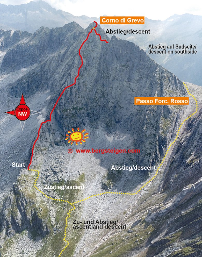 Siehe Topo. Die Ferrata folgt primär dem Nordwestgrat (Stufen bis max. D, oft C/D und C) und endet kurz unterhalb des Gipfels des Corno di Grevo. Am Ende klettert man noch 10-15 Minuten (markiert) auf dem griffigen und nicht so ausgesetzten Grat zum Gipfel (dieses Stück muss auch wieder abgeklettert werden).