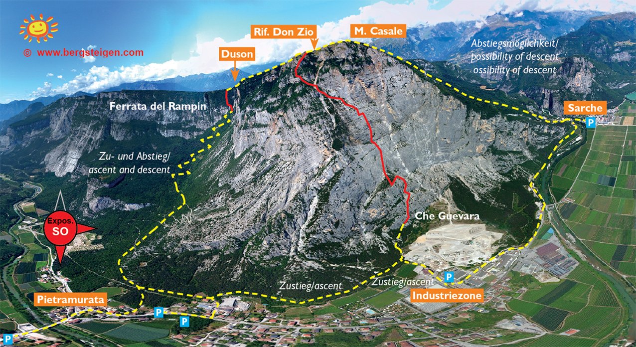 Anmerkung: Mit gesamt 1400 Hm der längste Klettersteig beim nördlichen Gardasee, vor allem im Sommer sollte man die Tour nicht unterschätzen. Bei Nässe ist die Ferrata wegen der oberen, erdigen Gehpassagen nicht zu empfehlen. Es liegt auf den Bändern viel Schutt - Steinschlag ist also in Thema. In den Sommermonaten Juli und August ist auf kühles Wetter zu achten.