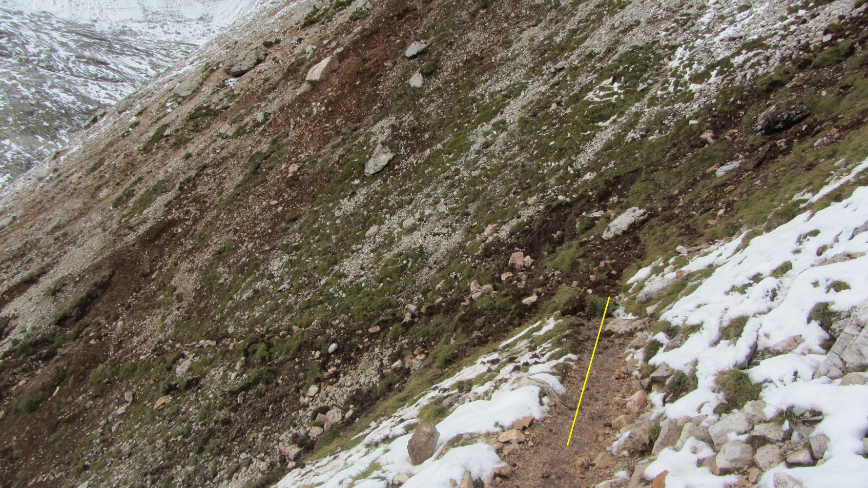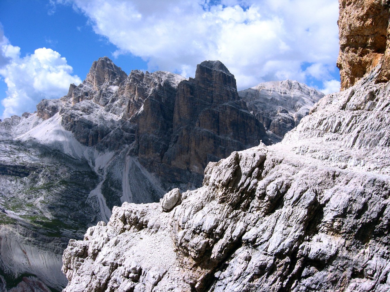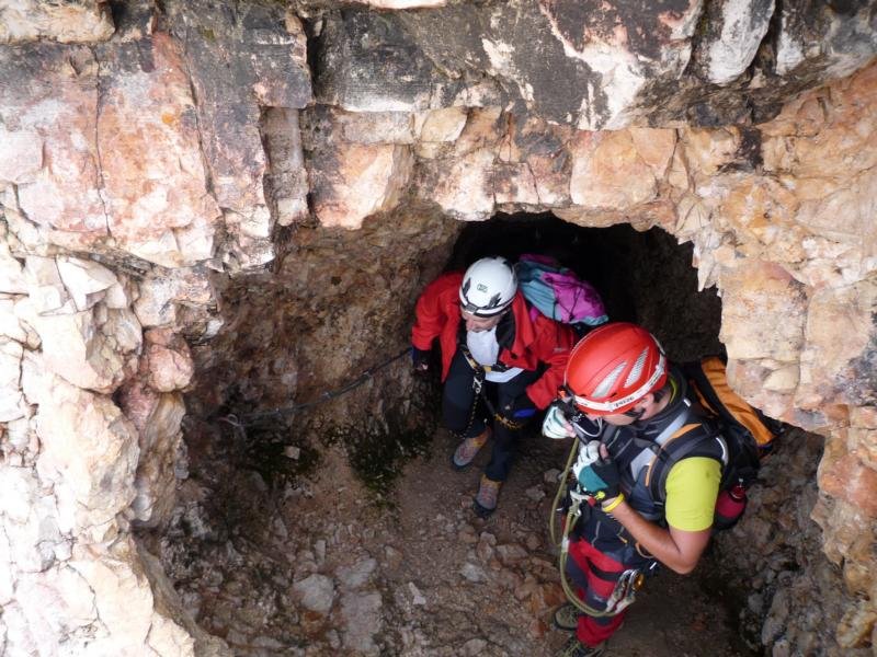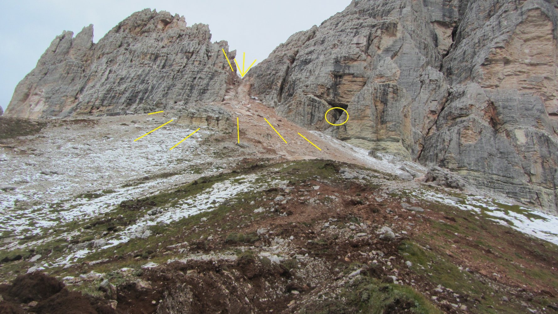 Zurück zur Weggabelung und rechts hinunter. Der Abstieg erfolgt im schlecht markierten Schrofengelände zum ehemaligen Rifugio Cantore (2542 m). Weiter auf Weg 403 zum Ausgangspunkt absteigen. Alternativ kann man teilweise im Geröll ablaufen.