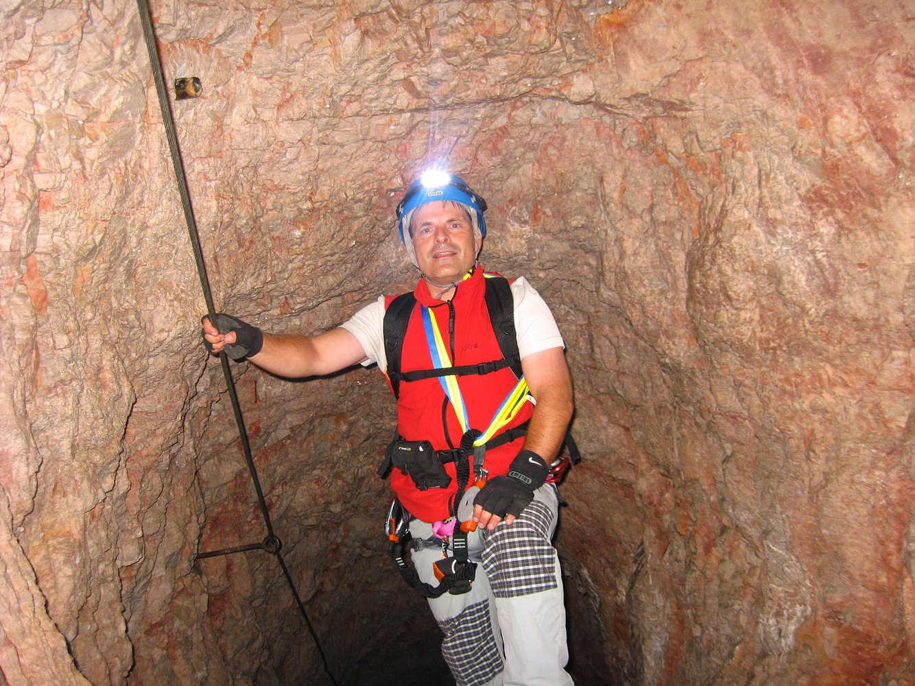 Komplette Klettersteigausrüstung, Helm, Stirnlampe, im Frühsommer evtl. Steigeisen und Pickel.