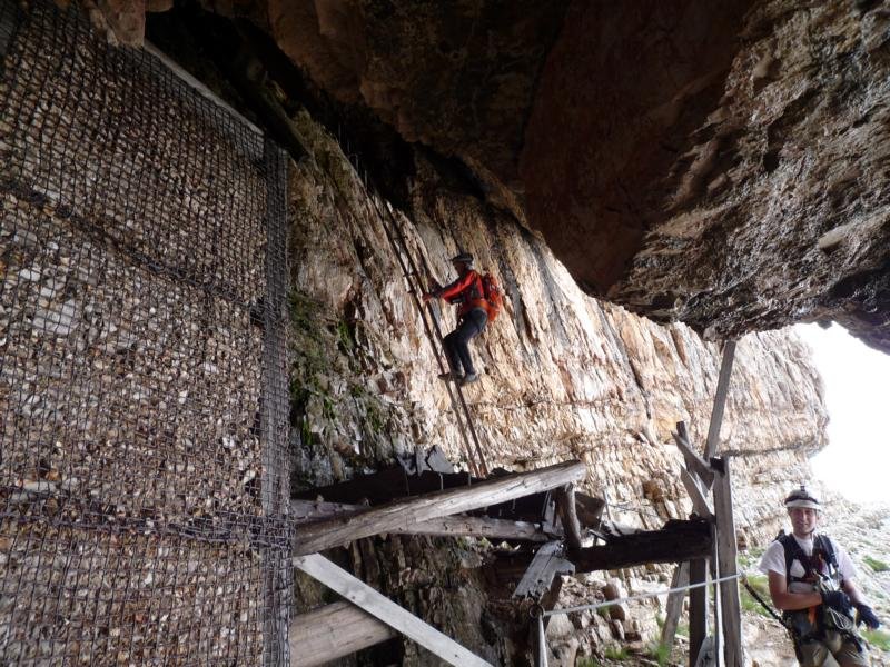 Vom Einstieg über eine Reihe aus Klammern und Leitern (A/B) in einen etwa 300 m langen Stollen. Durch den steilen Stollen aufsteigen und danach kurz abklettern (zuerst A/B, dann B). Dort befindet sich ein Notabstieg Richtung Col dei Bòs. Nach einem längeren Stück Gehgelände folgt der „offizielle“ Einstieg (Einstiegskoordinaten: N46.53859, E12.04220). Gestuft (A bis A/B) geht es auf ein Band (A und Gehgelände). Die steile Schlüsselstelle (C/D, später C) und einige Felsstufen (B) führen zu einem Spreizschritt (A). Auf einem Band (meist Gehgelände, eine Stelle A/B) leicht absteigend zu einer mächtigen Schlucht (A), die in ihrem hintersten Ende gequert wird. Nach einem kurzen Stück Gehgelände folgt der nächste Aufschwung (A bis B/C). Danach geht es wieder leicht absteigend (größtenteils Gehgelände und A) zu einem weiteren Aufschwung (A bis B/C). Abermals folgt ein Band (A bis A/B), welches zu einem schönen Rastplatz beim Felsgebilde Tre Dita (2694 m) leitet. Hier befindet sich links ein Notausstieg zum Rifugio Giussani. Der Klettersteig folgt einem großen Band (Gehgelände) nach rechts. Über eine Steilstufe (B/C) ins Schrofengelände (A bis A/B) und über eine weitere Steilstufe (B/C) auf ein Band (A). Eine nahezu senkrechte Wand (C) stellt die Schlüsselstelle des oberen Teils dar. Über einen letzten Aufschwung (B/C) wird das Ausstiegsband (A) erreicht. Man folgt dem Steig bis zu einer Weggabelung und steigt rechts weiter zum Gipfel auf.