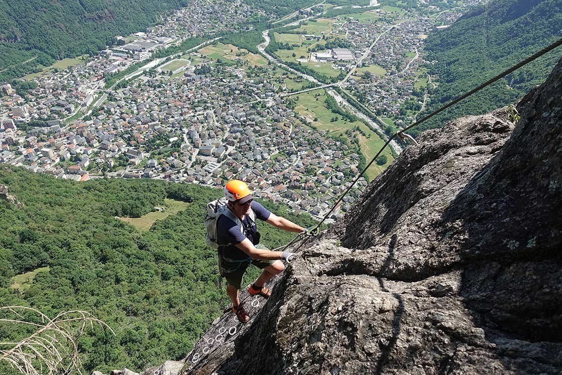 Die Pietro Biasini verläuft an einer steilen Felswand hoch oberhalb der Stadt Chiavana. Der Klettersteig ist recht gut mit Stahlseilen und sehr vielen Trittklammern ausgeführt, es macht Spaß, wie auf einer Leiter an der mächtigen Felswand höher zu steigen. Im Mittelteil der Felswand mündet die Ferrata in den Percorso Attrenzzato und man steigt entlang dieser einfachen Ferrata bis zum Bergdorf Daloo auf. Vom einem schönen Aussichtspunkt hat man einen perfekten Ausblick auf die Bergriesen im Bergell!
