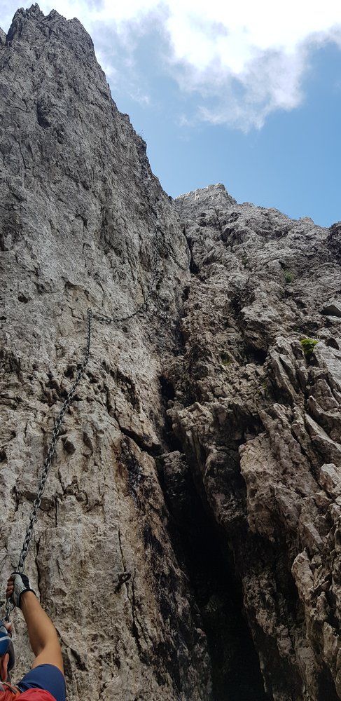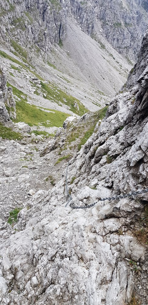 Über ein leichteres Band und Gehgelände kommt man zur 2ten Schlüsselstelle: Eine steile Rinne die jedoch am Seil gut bewältigbar ist.