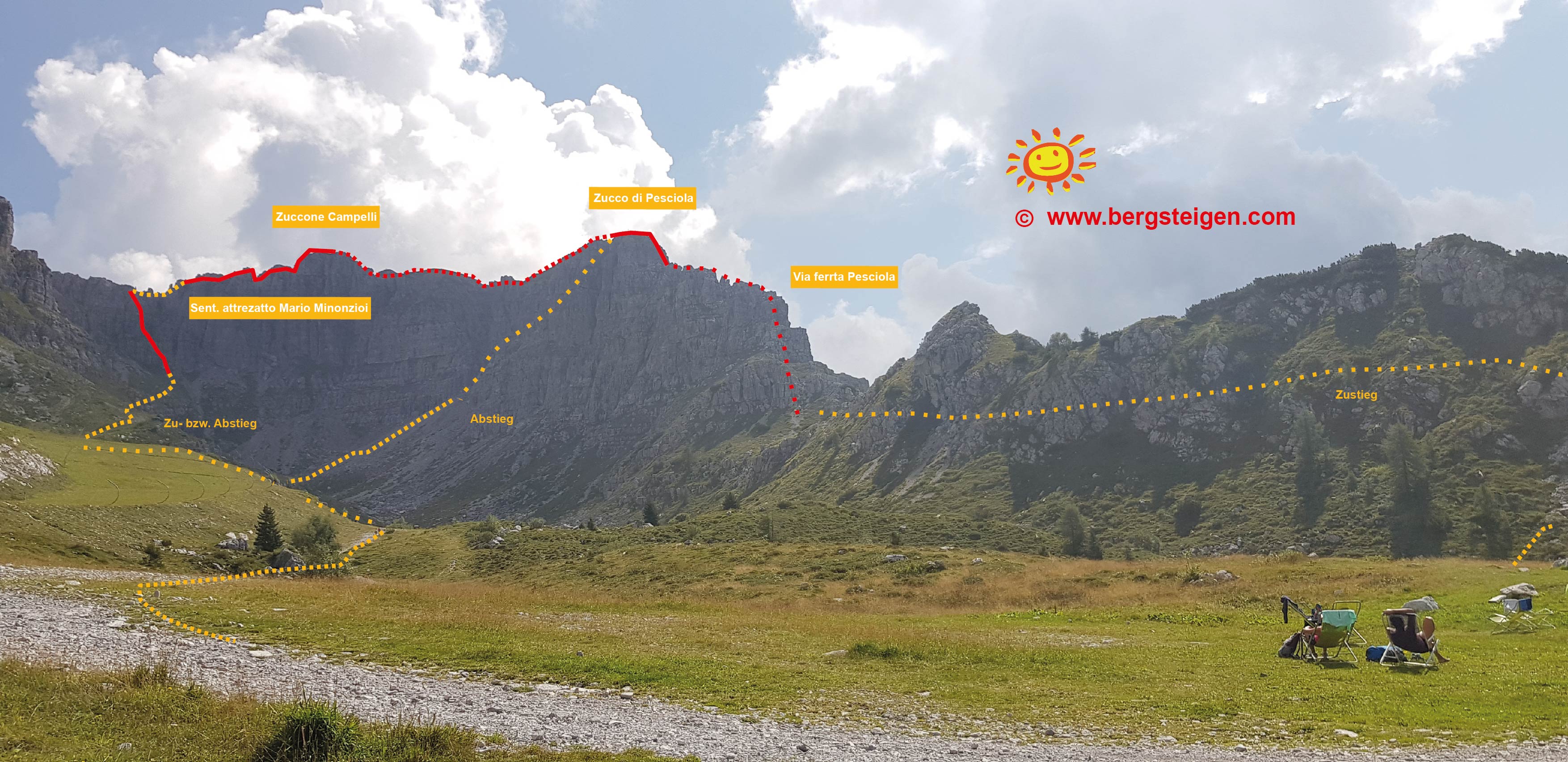 Vom "Zucco dei Campelli" in Richtung Süden zu einer Scharte absteigen und in das Valle dei Camosci gehen. Dort trifft man, schon sichtbar wieder auf den Zustiegsweg.